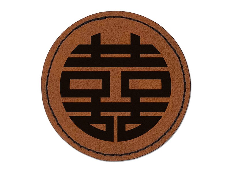 Chinese Symbol Shuangxi Marriage Double Happiness Round Iron-On Engraved Faux Leather Patch Applique - 2.5"