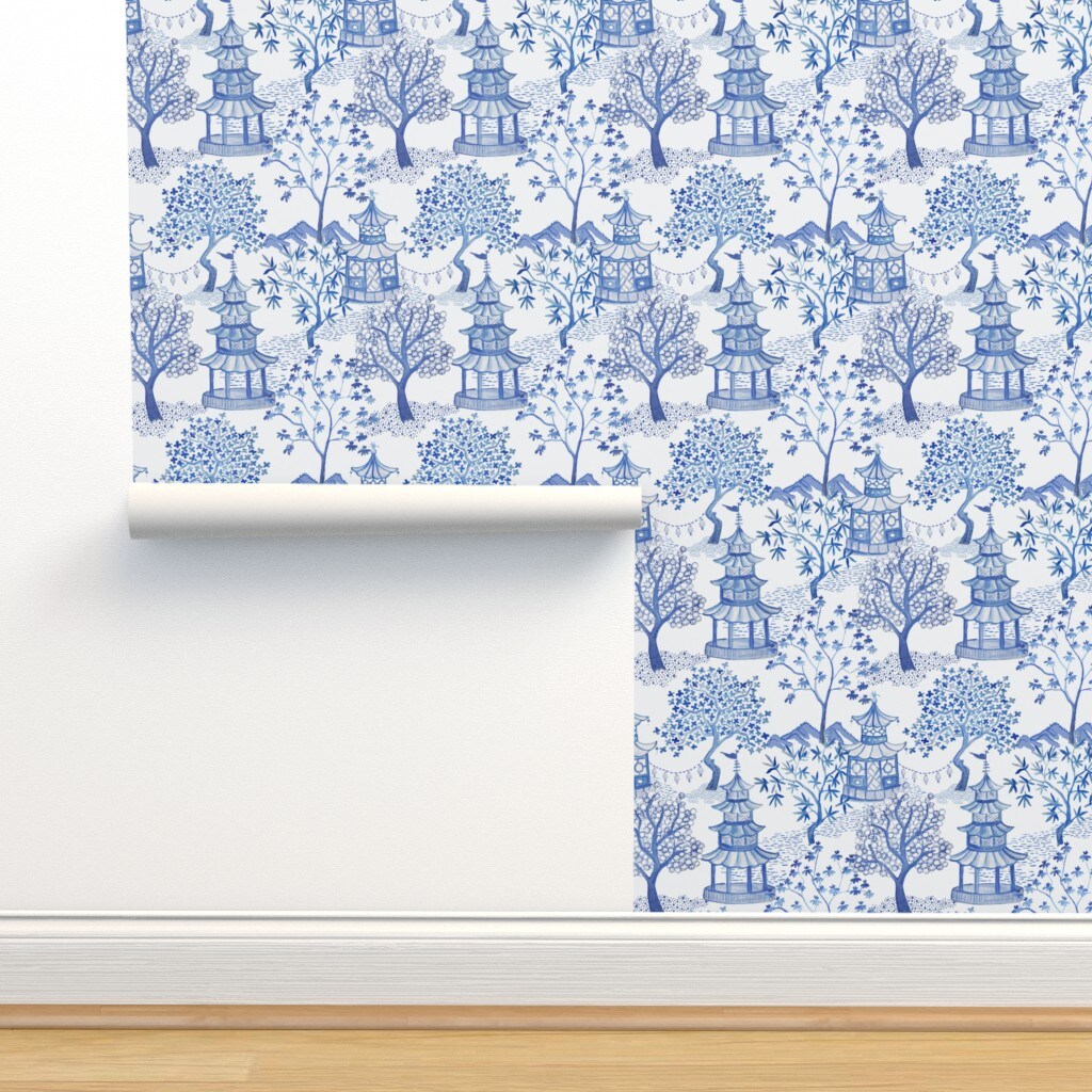 Chinoiserie Blue White Toile Pagoda Landscape And Asian Art Custom Pre-pasted Wallpaper by Spoonflower Pre-Pasted Wallpaper 2FT Wide