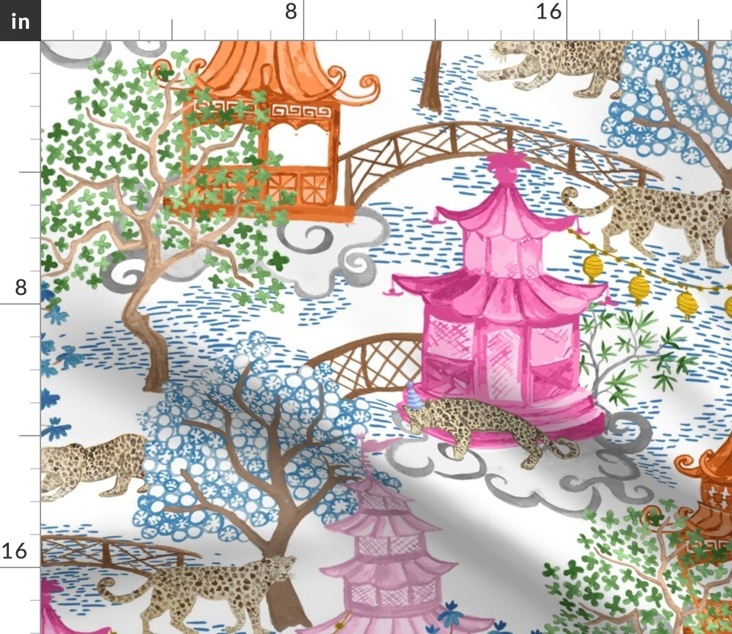 Chinoiserie Pagoda Leopards Pink And Rust Asian Inspired Watercolor Landscape Custom Printed Fabric by Spoonflower Various Fabrics by the Yard or Fat Quarter