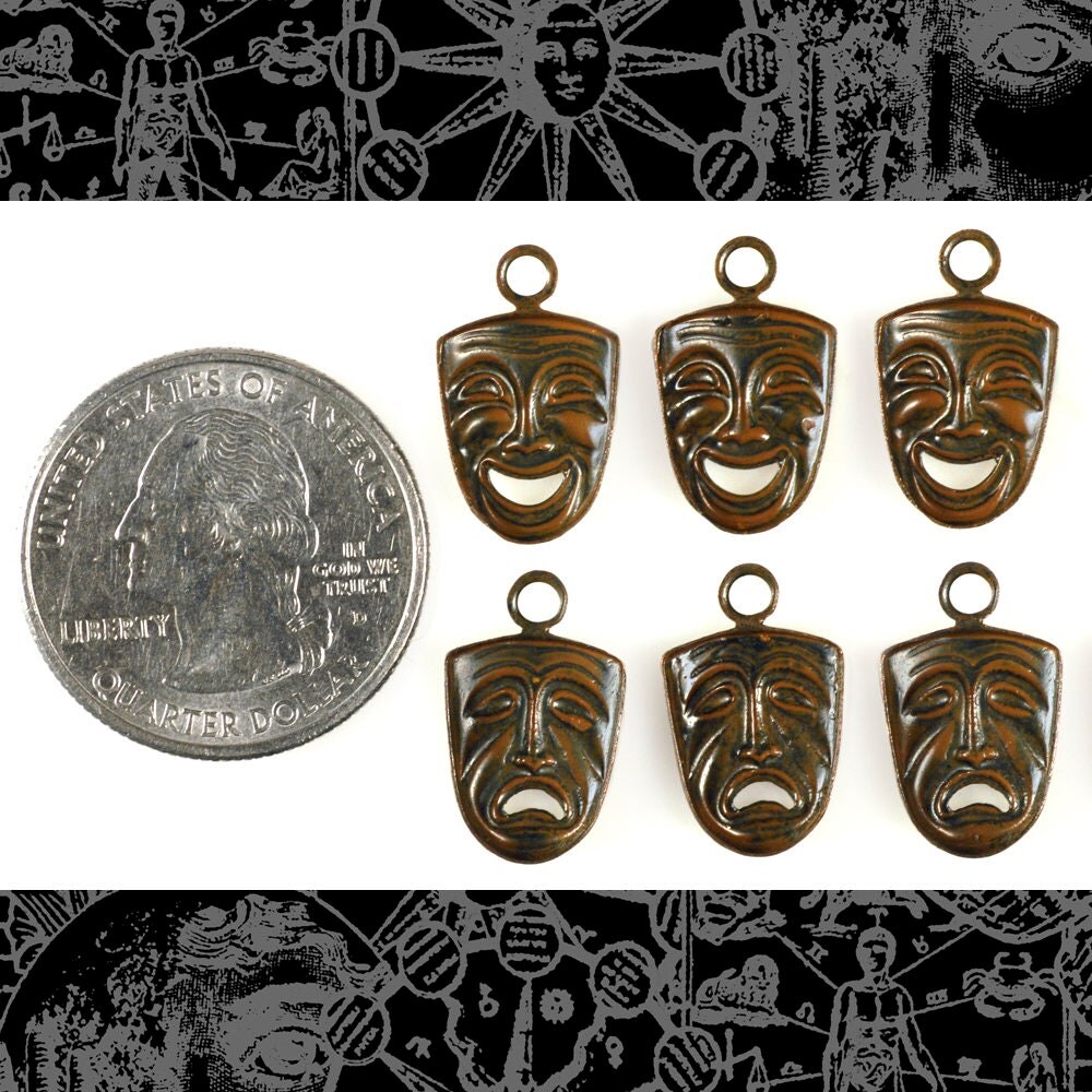 Chocolate Brown Plated Brass Drama Mask Charms Set of Six Three Happy Three Sad - RB-C182