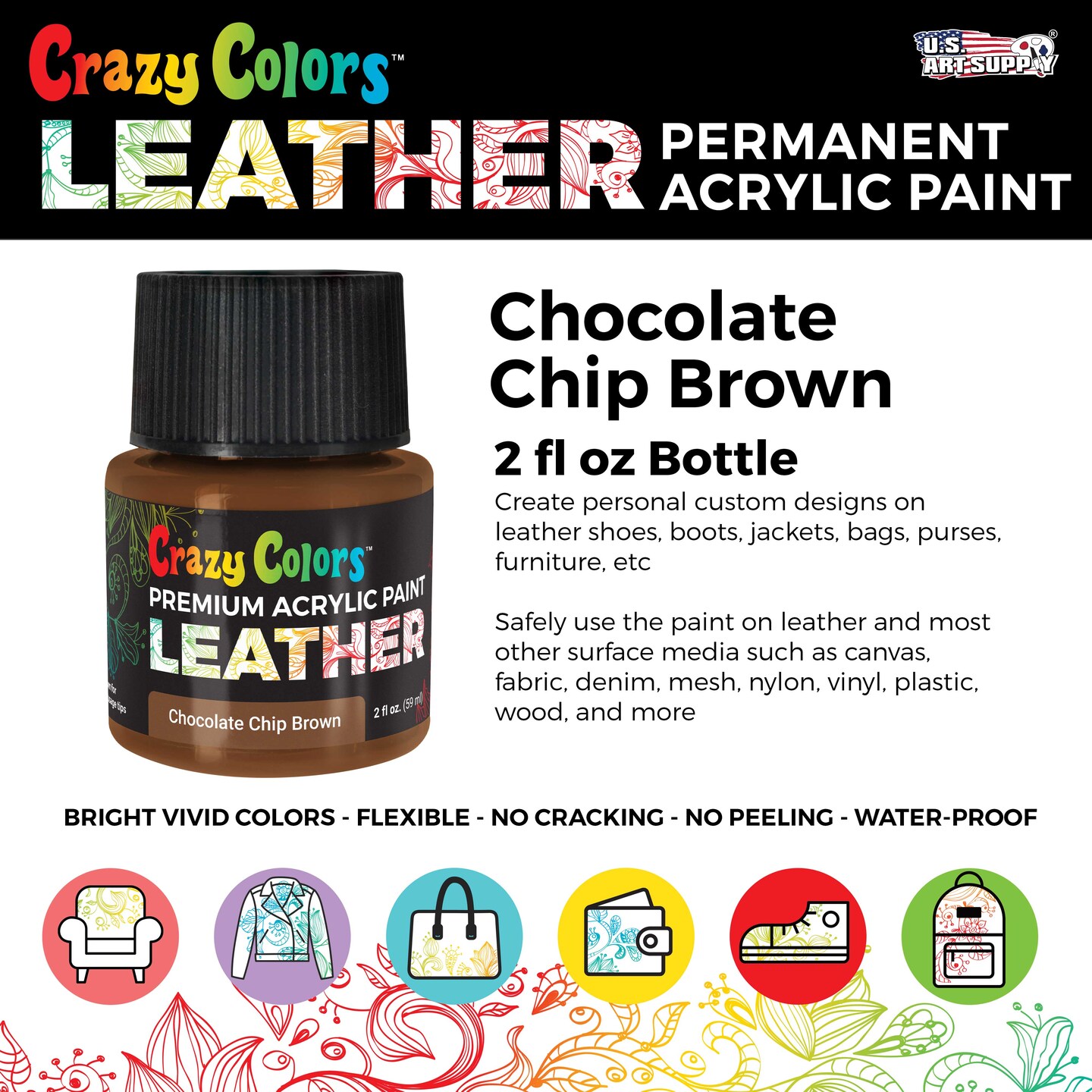 Chocolate Chip Brown Premium Acrylic Leather and Shoe Paint, 2 oz Bottle - Flexible, Crack, Scratch, Peel Resistant - Artist Create Custom Sneakers, Jackets, Bags, Purses, Furniture