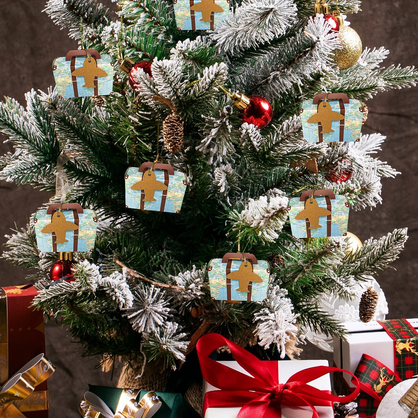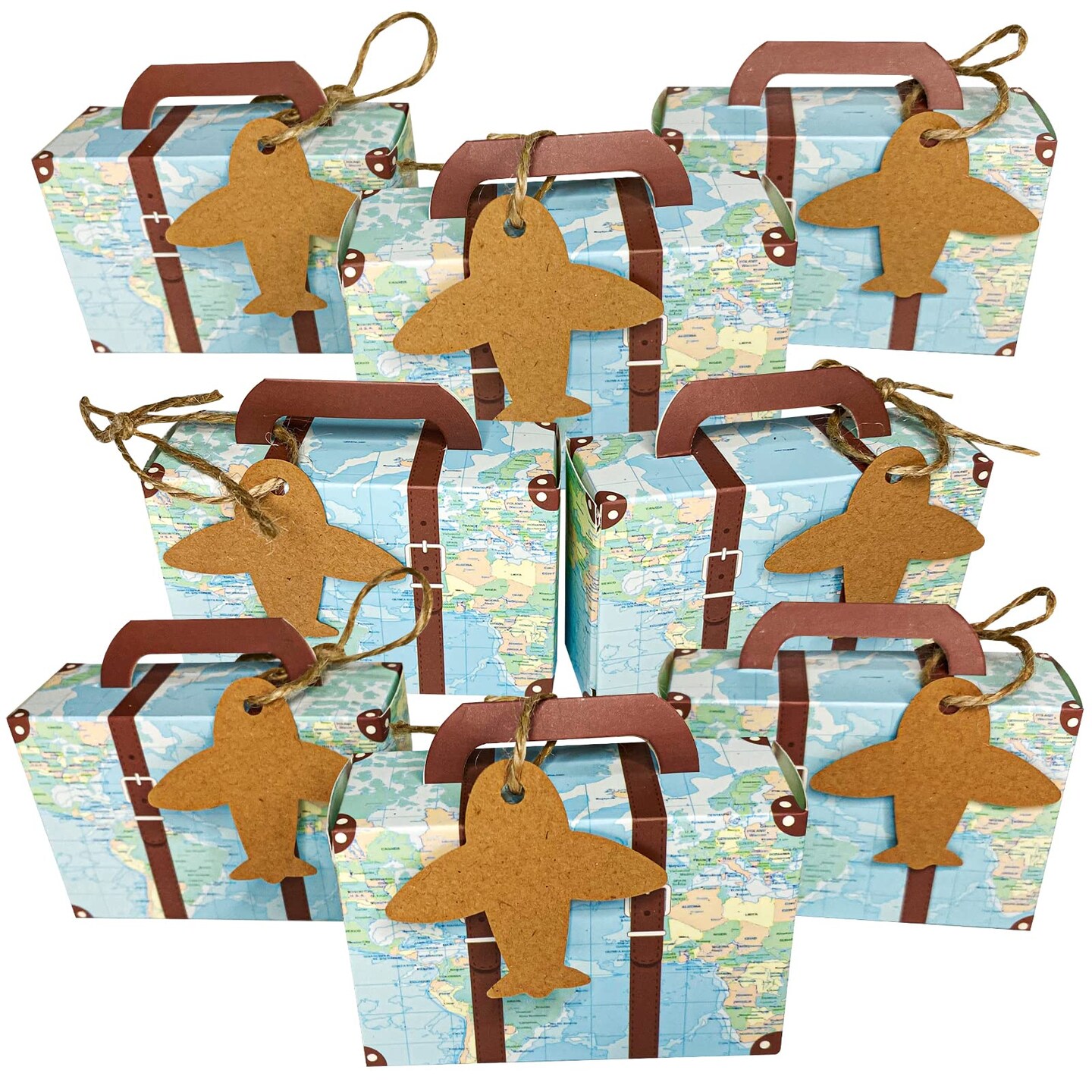 CHolic 50Pcs Party Favor Candy Box, World Map Mini Suitcase Favor Box, Vintage Kraft Paper with Tags and Burlap Twine for Travel Themed Party, Bridal Shower, Wedding Decorations