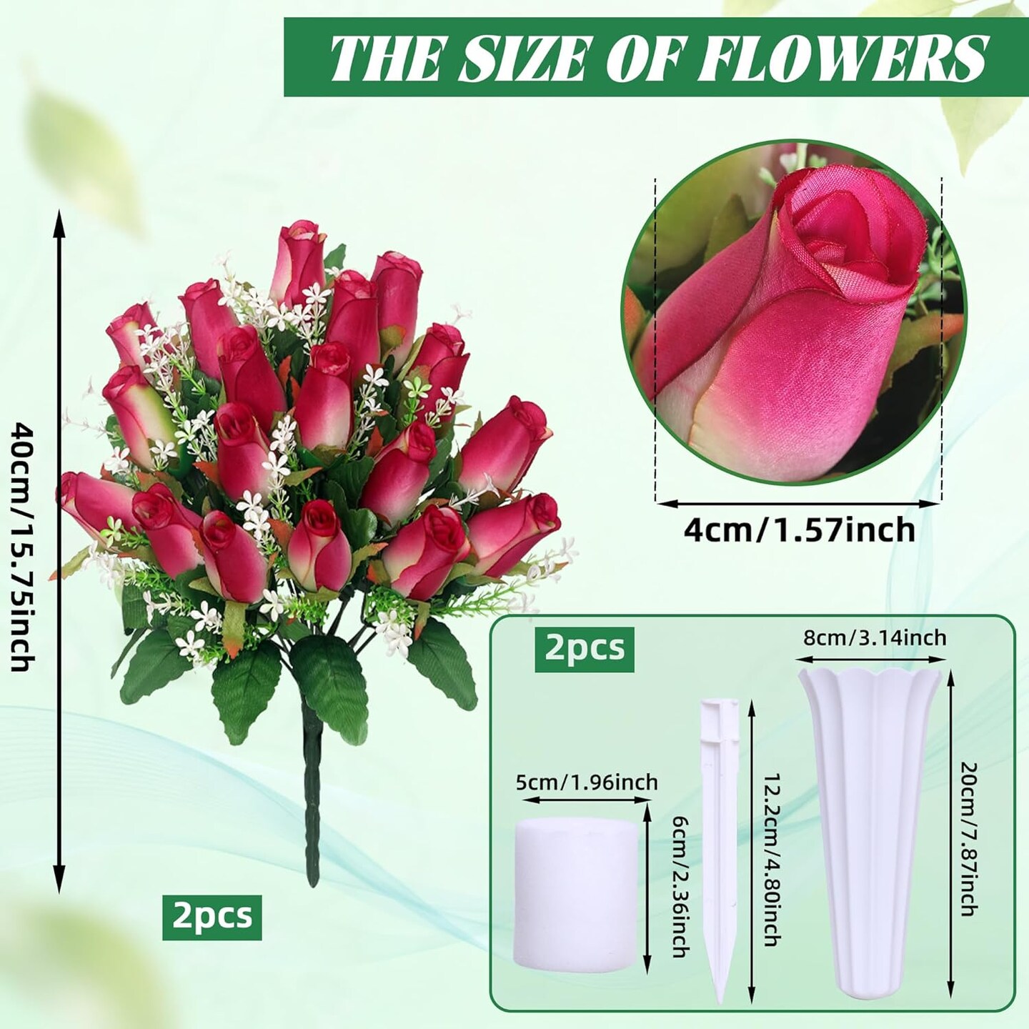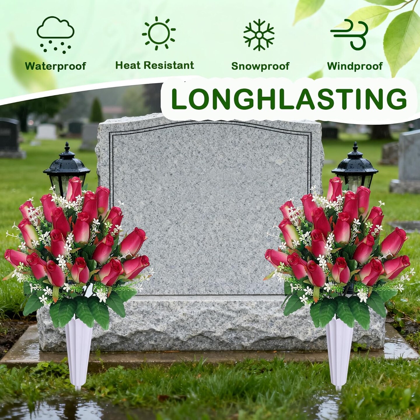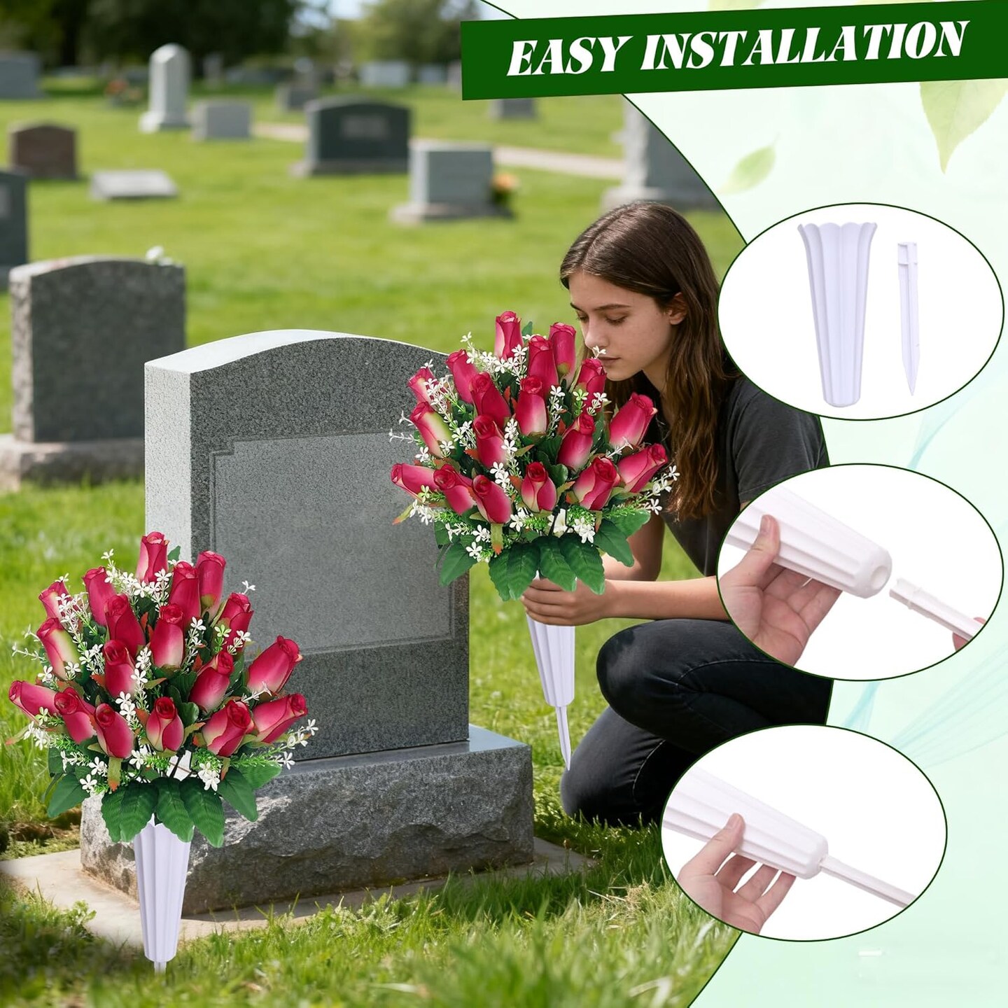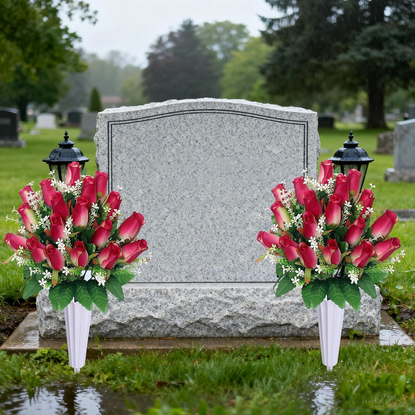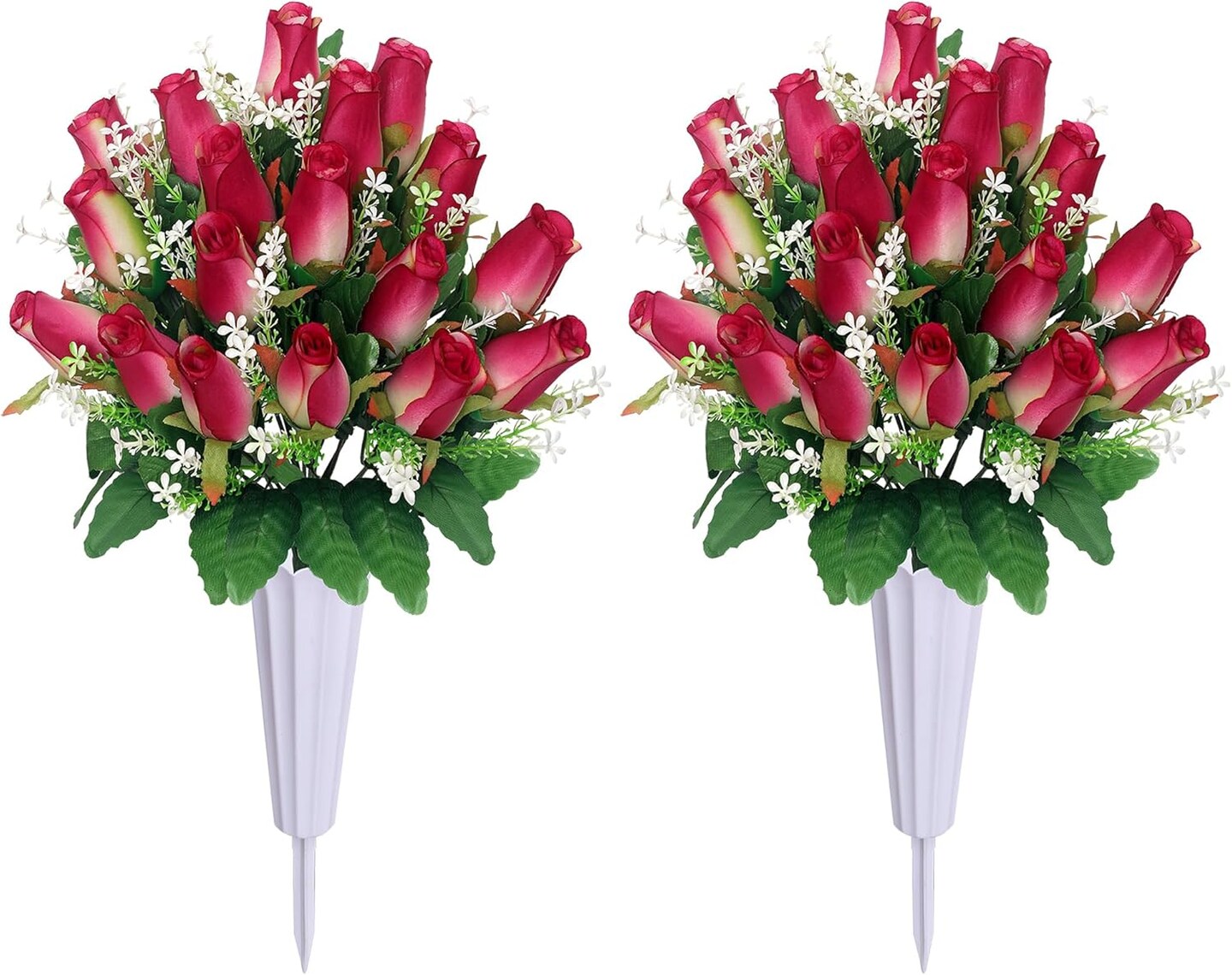 Christmas Artificial Cemetery Flowers for Grave – Rose Pink Memorial Bouquet with Vase for Headstone and Tombstone Decorations