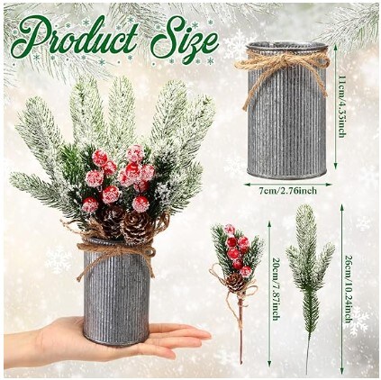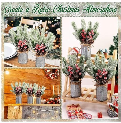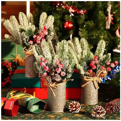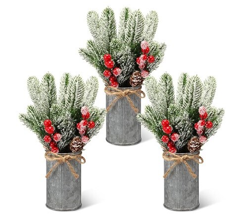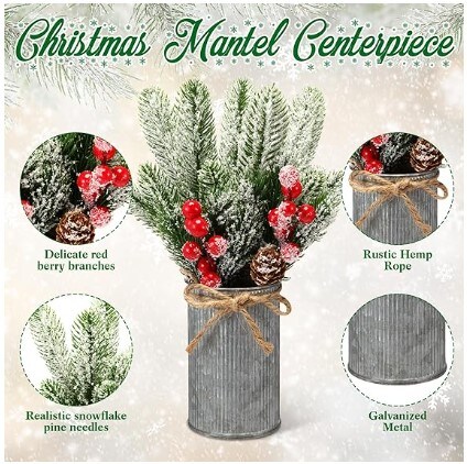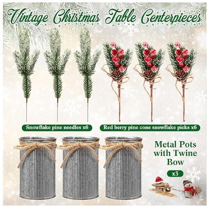 Christmas Centrepiece Table Decorations 3 Sets Floral Arrangement for Christmas Christmas Decor for Table Indoor Kitchen Shelf Mantle Farmhouse Galvanised Pot with Pine Cone Red Holly Berry Pick (Tin Colour)