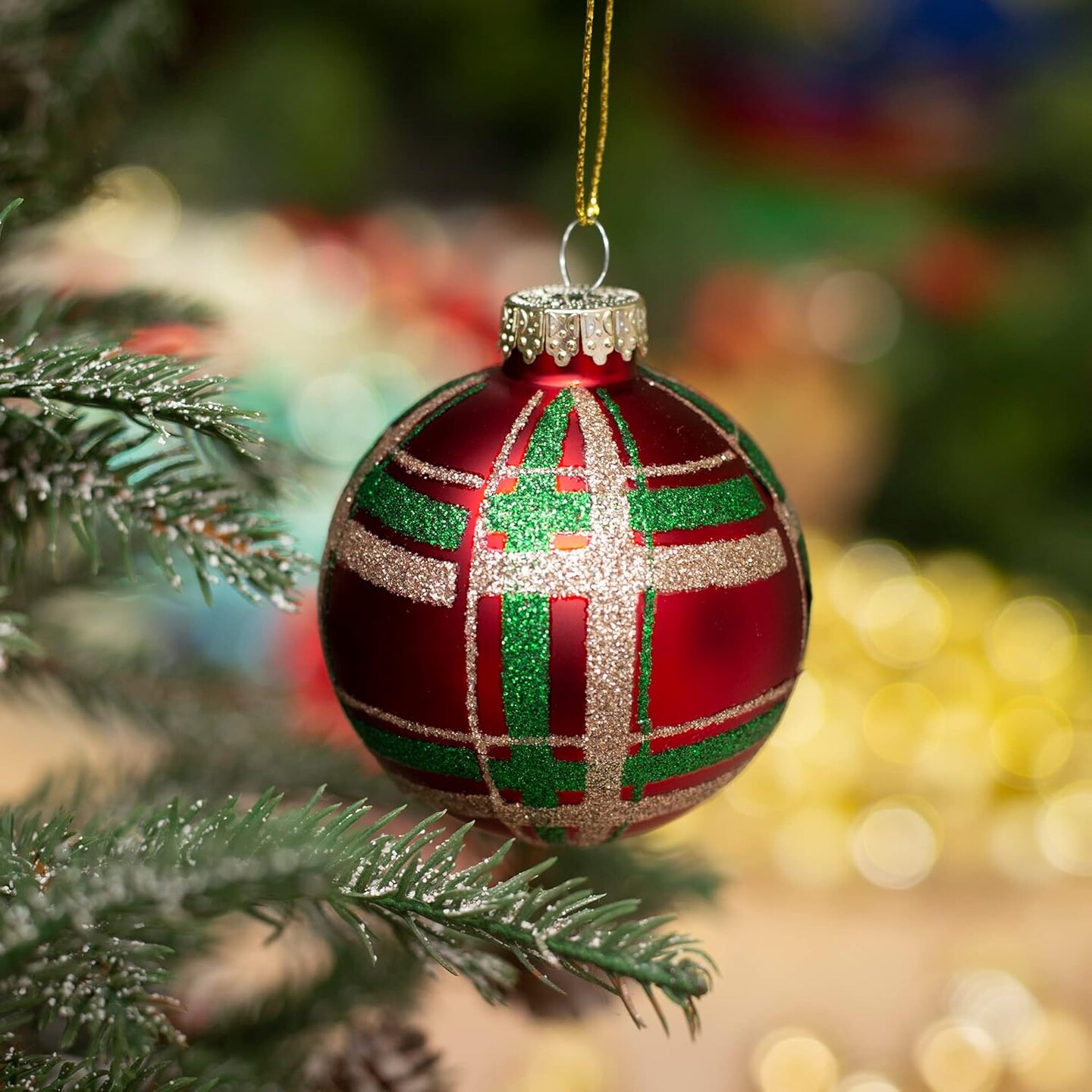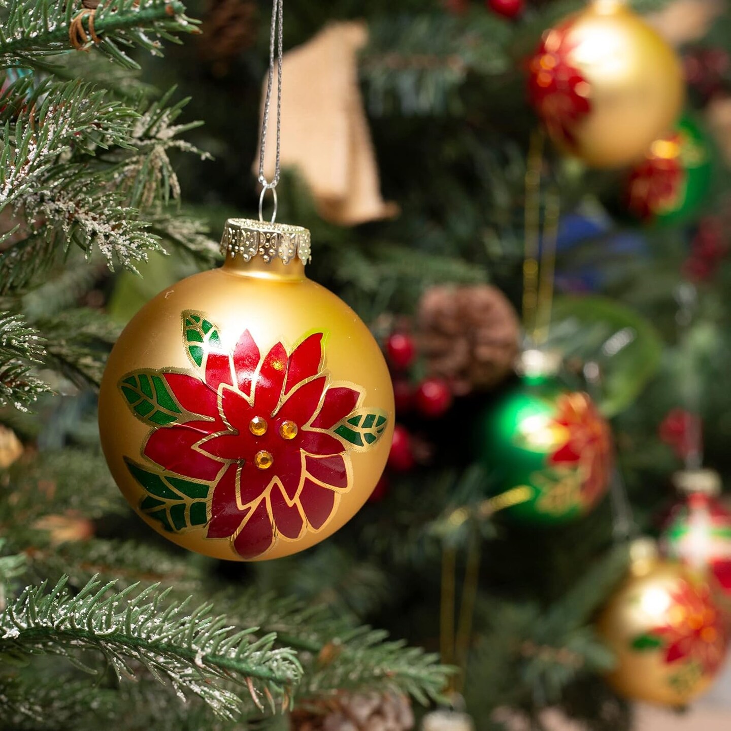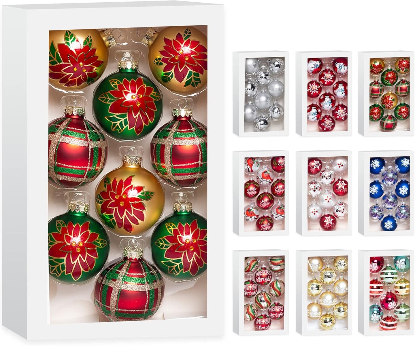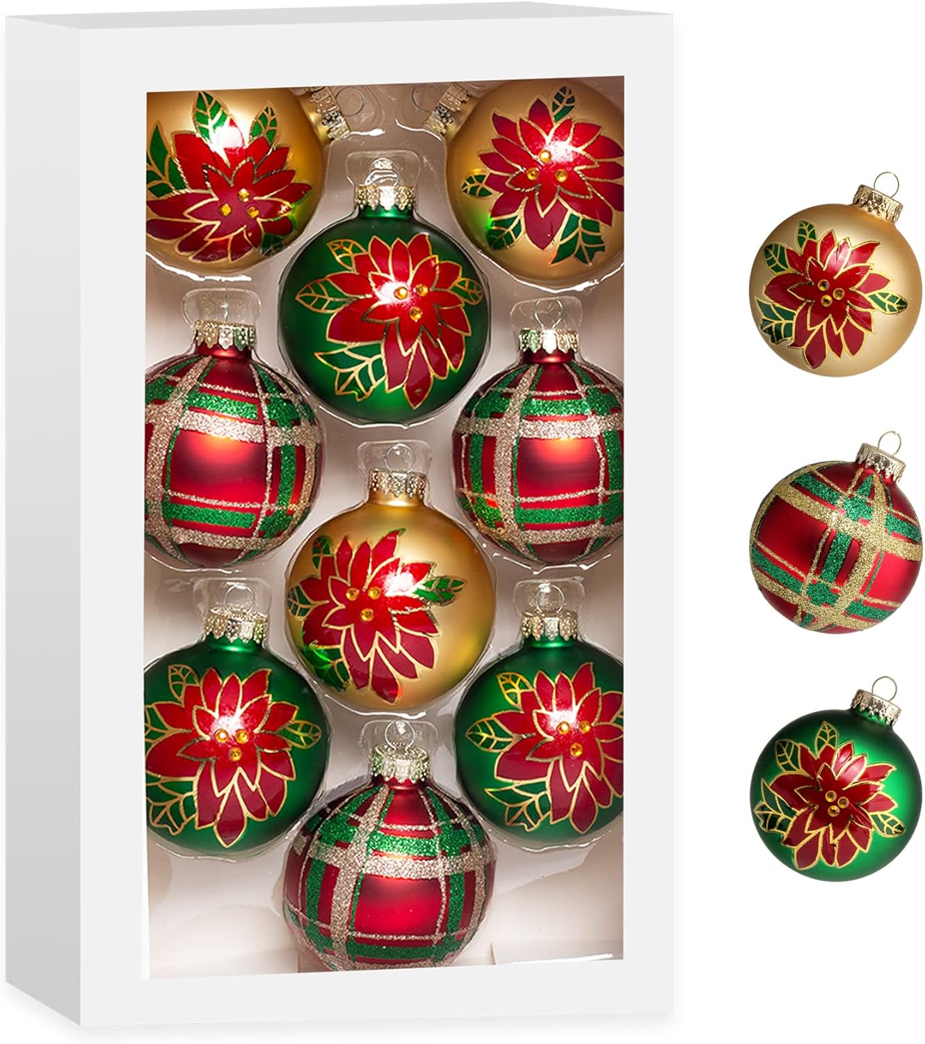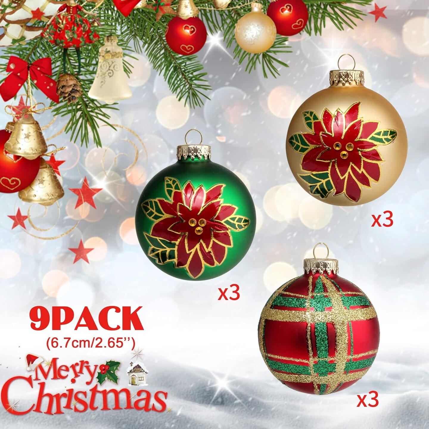 Christmas Colorful Glass Balls Decoration 9pc 2.65in (Red Gold Green Floral)