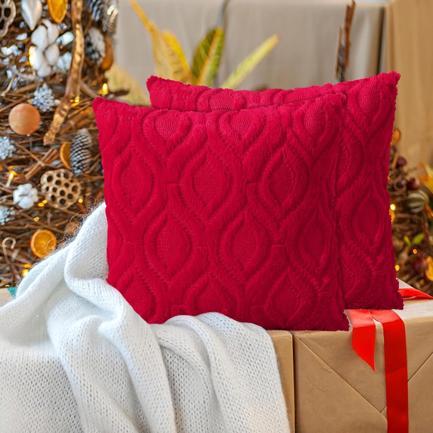 Christmas Decorative Throw Pillow Covers 18x18, Soft Plush Faux Wool Couch Pillow Covers for Home, Set of 2, Red
