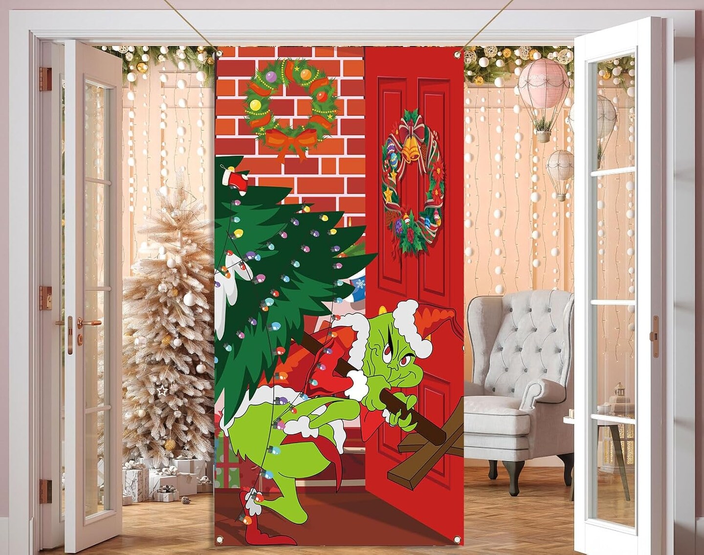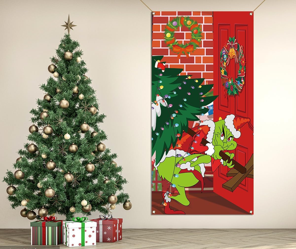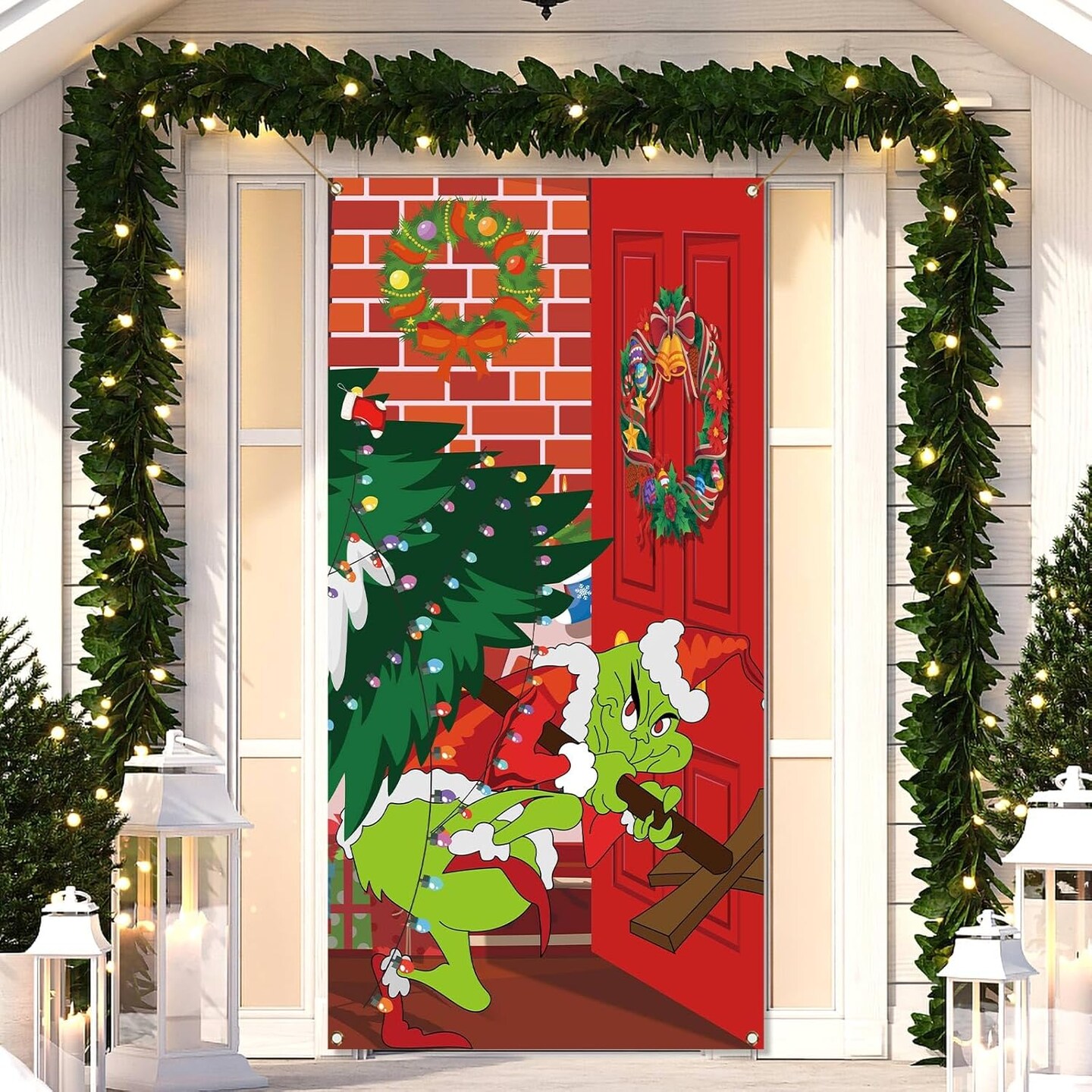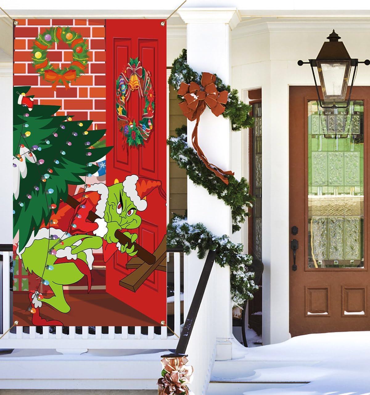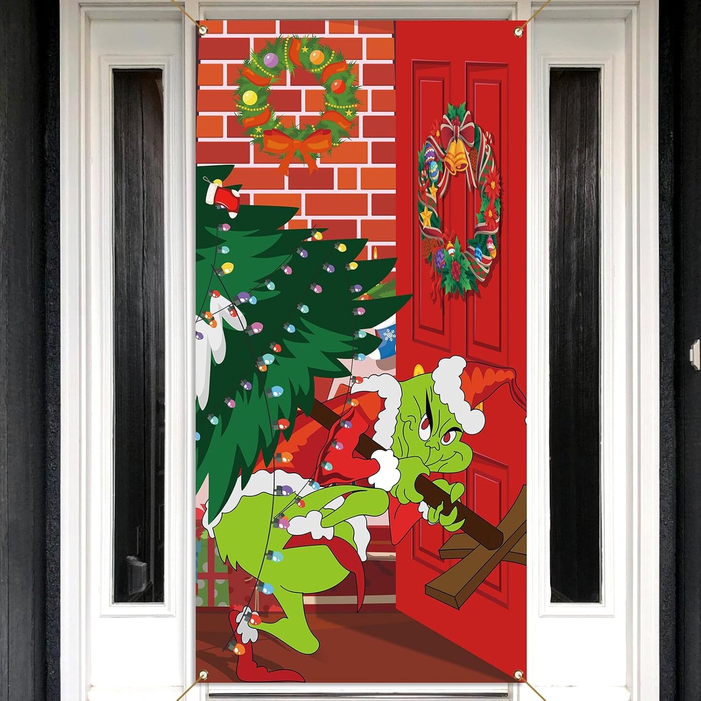 Christmas Door Cover Xmas Winter Holiday Party Decoration Front Porch Sign(Red and Green)70.87"L x 35.43"W