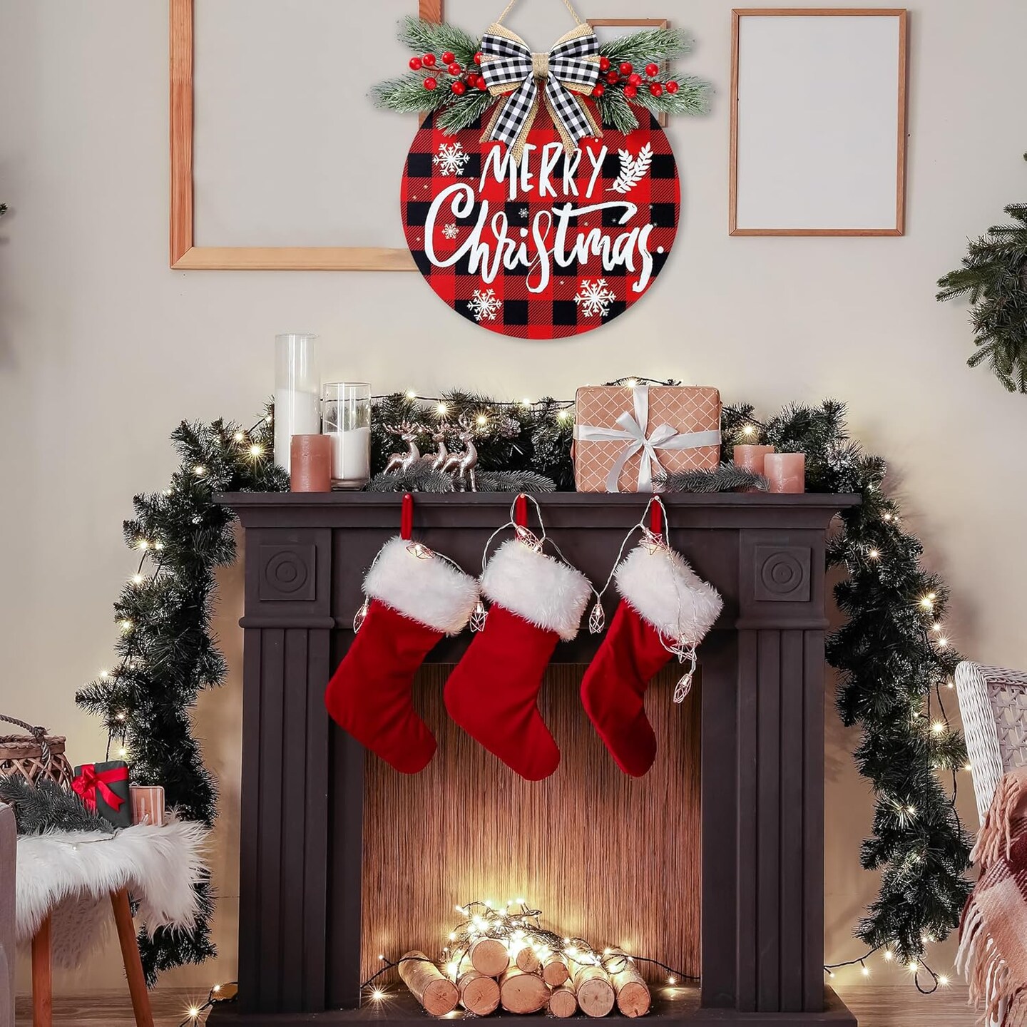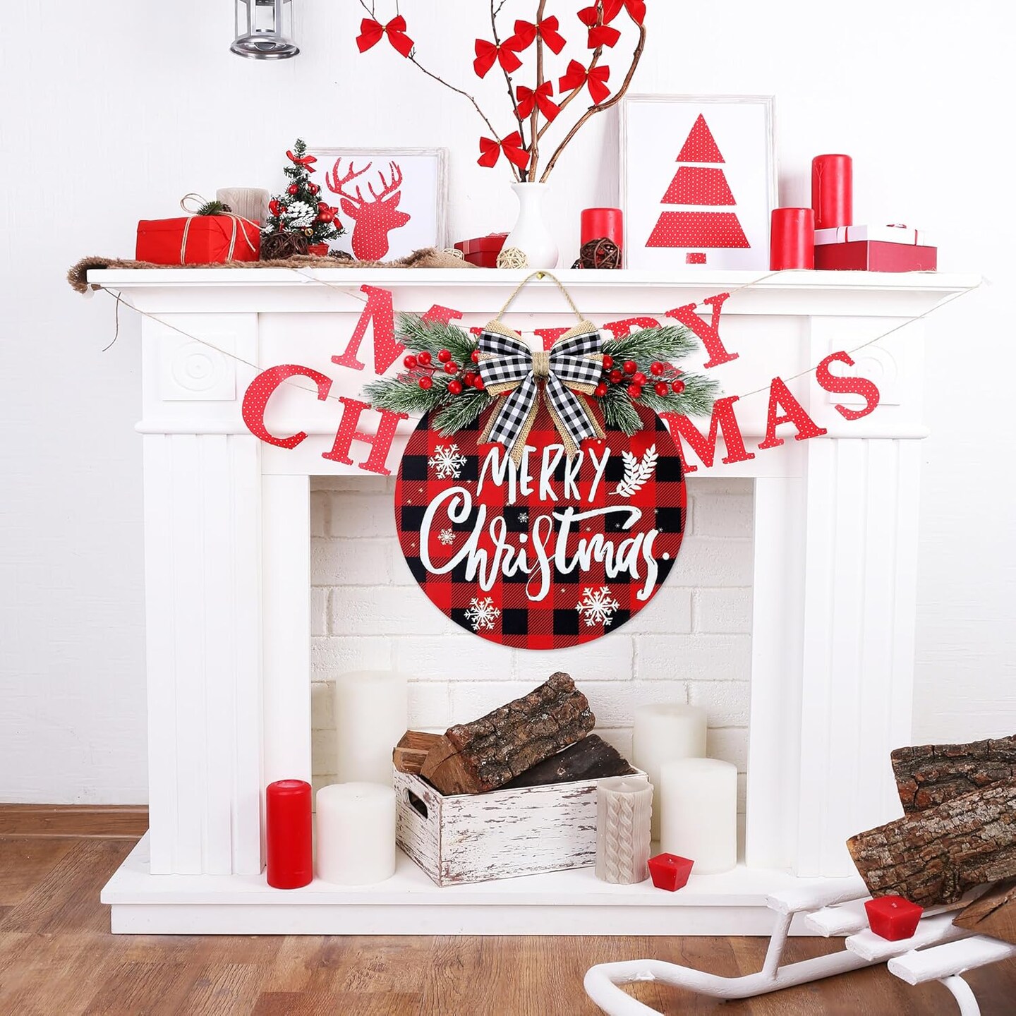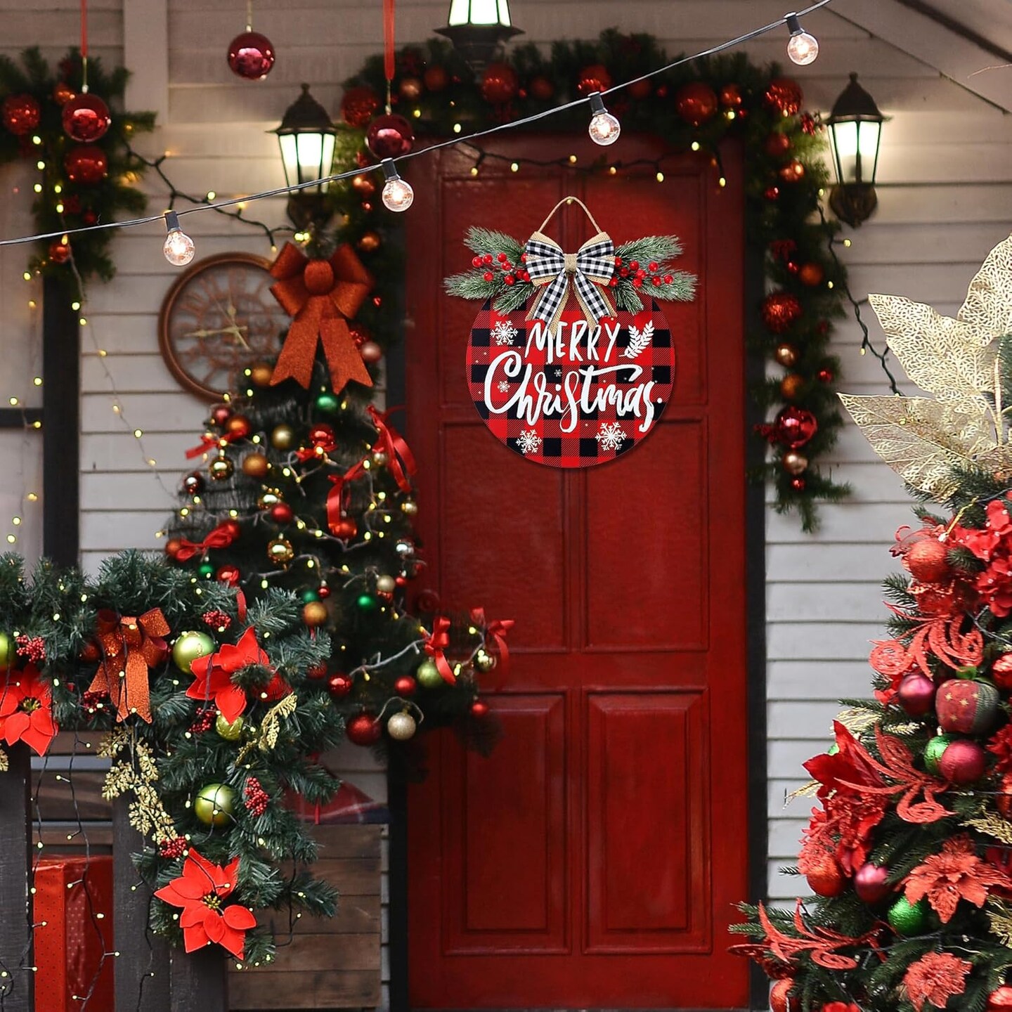 Christmas Door Sign Buffalo Plaid 12'' Welcome Sign Xmas Decorations Merry Christmas Wreath for Porch Wall Hanging Wreath Rustic Farmhouse Window Holiday Winter Wooden Indoor Outdoor Decor