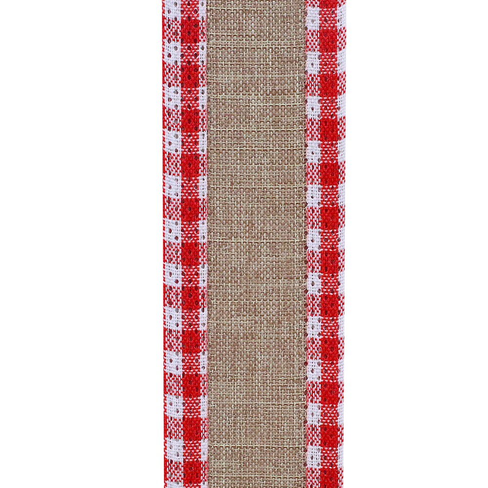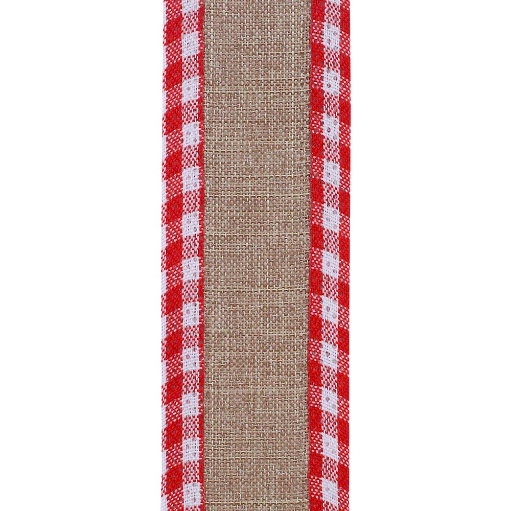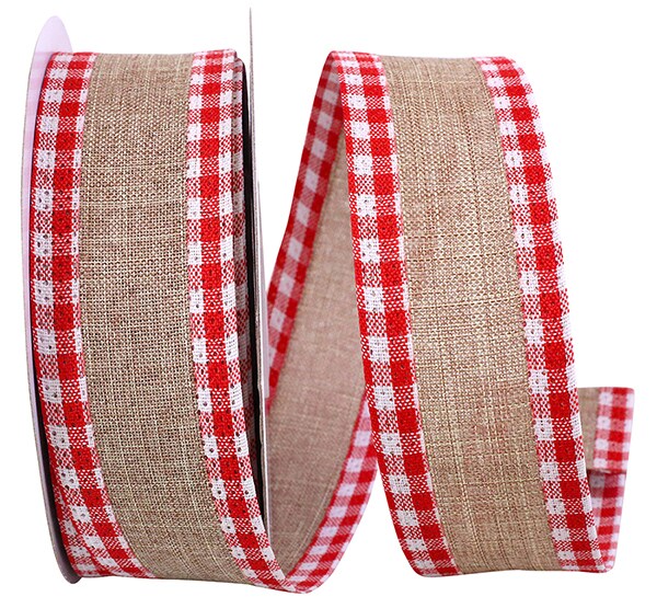 Christmas Linen Gingham Check Wired Edge Ribbon - 1 ½ inch x 10 yards - Natural / Red
