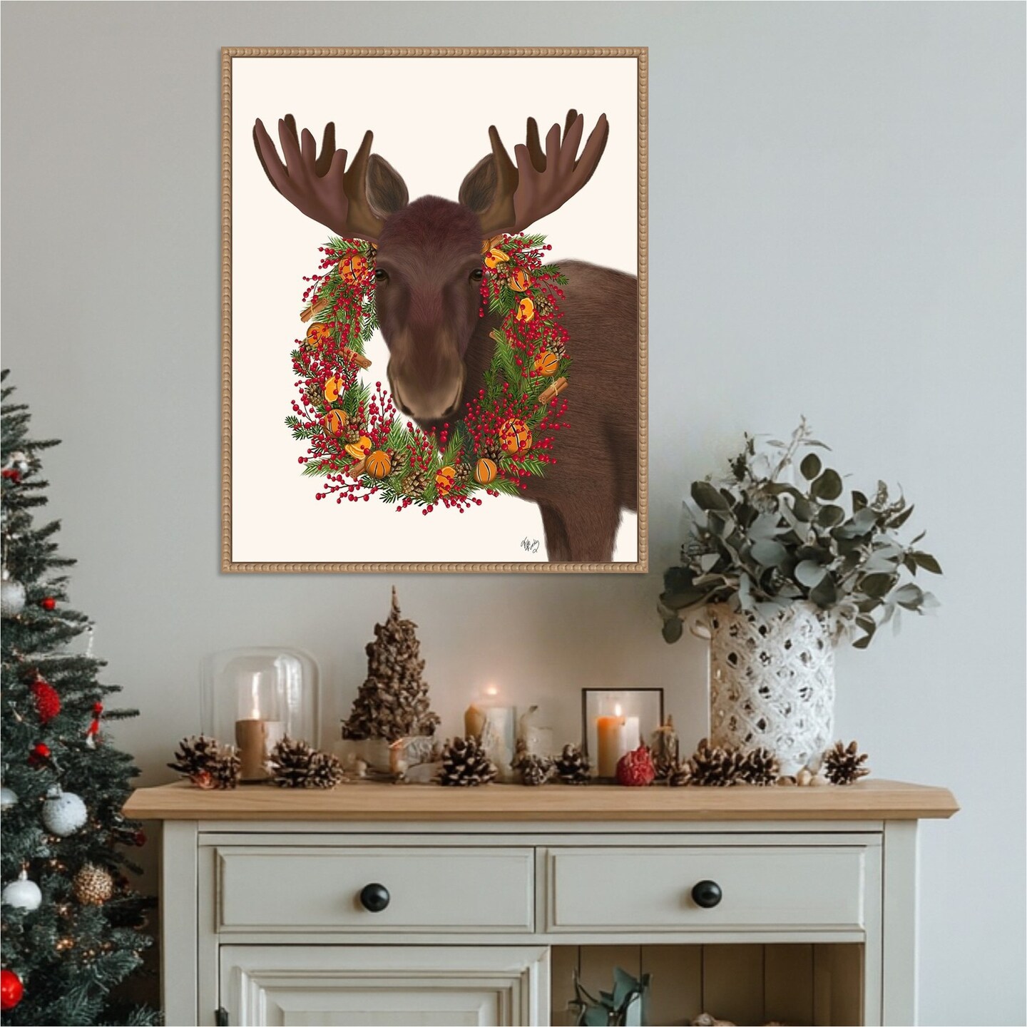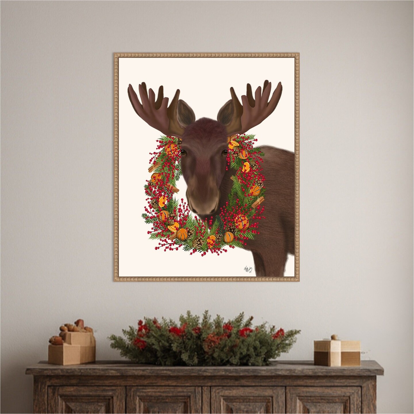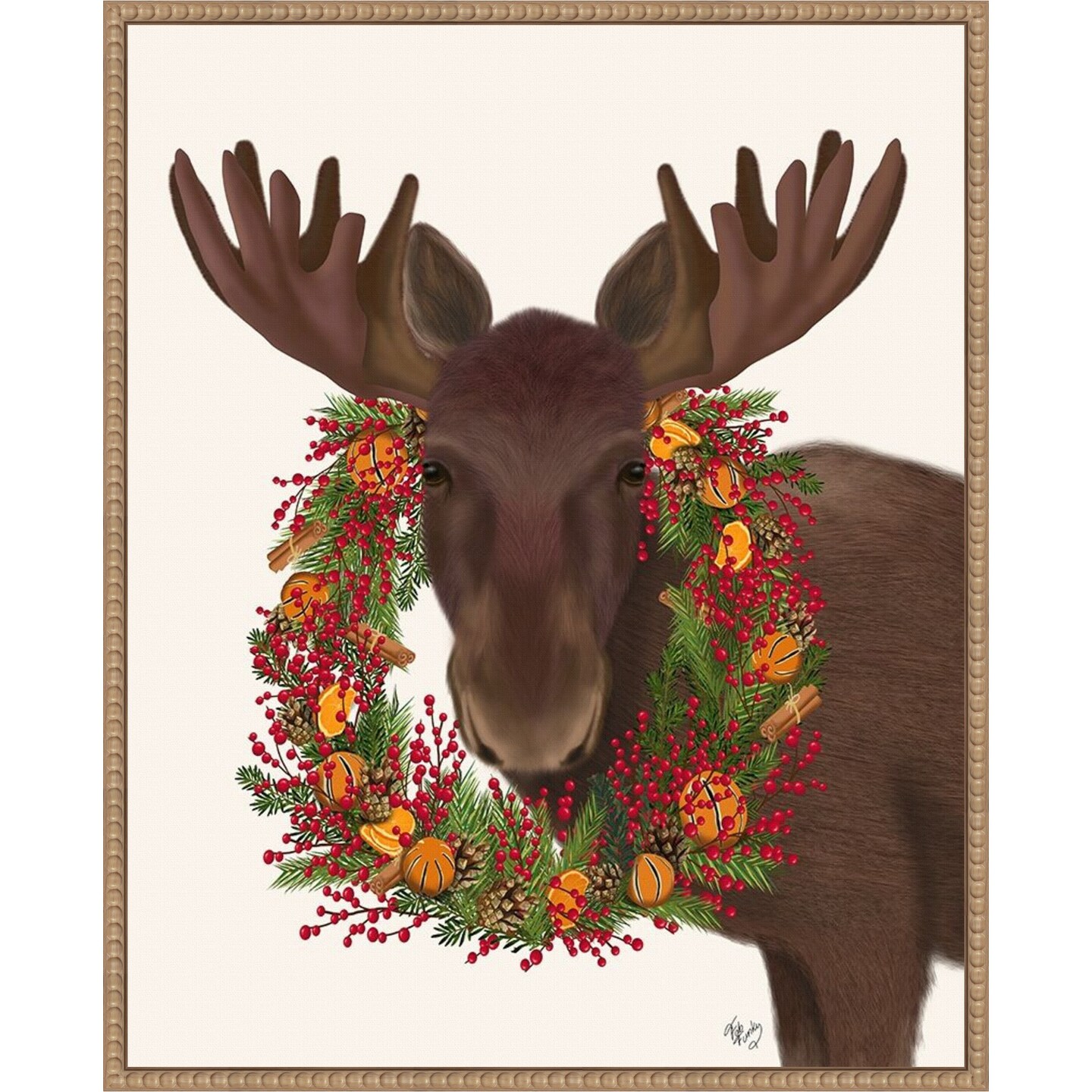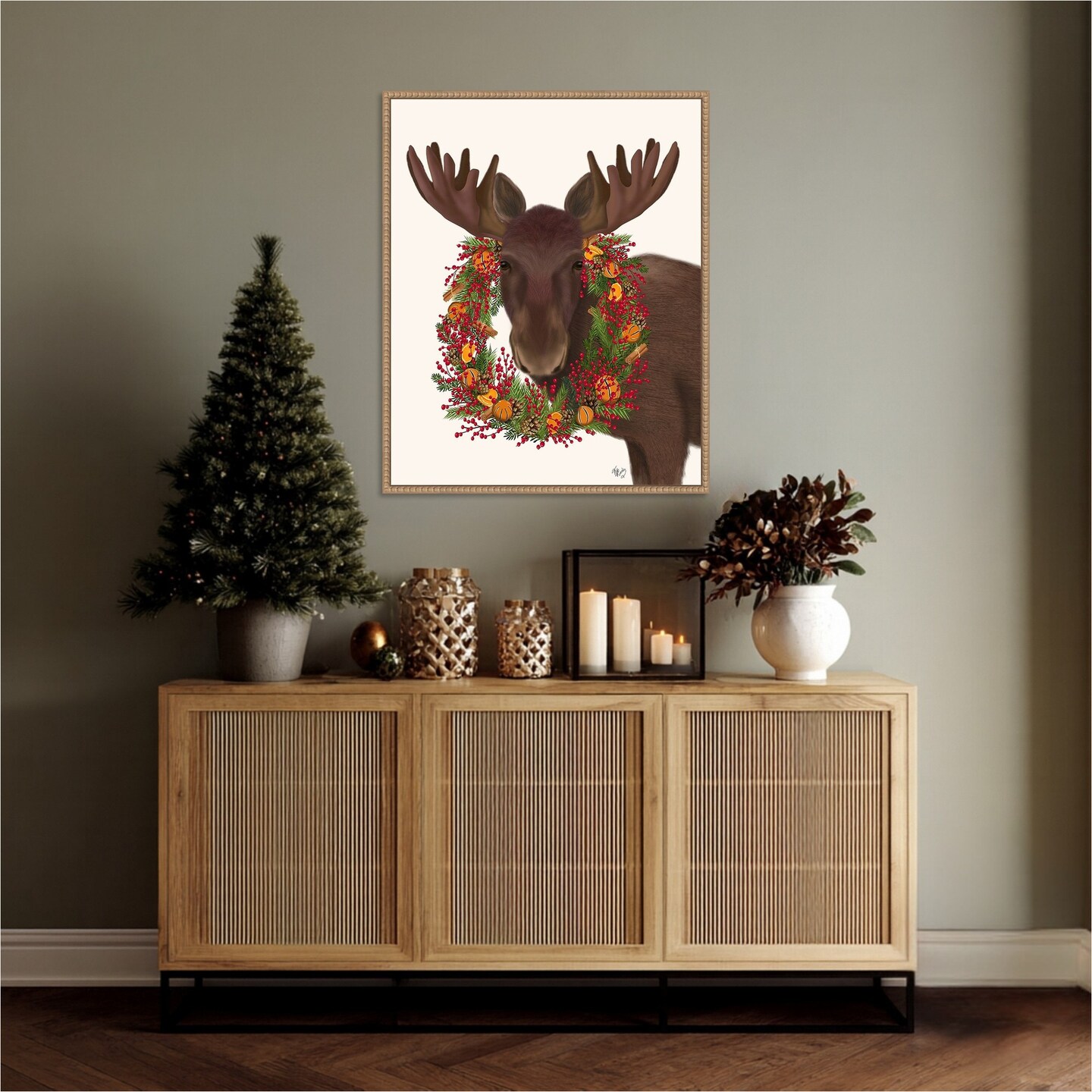 Christmas Moose and Cranberry Wreath by Fab Funky 23-in. W x 28-in. H. Canvas Wall Art Print Framed