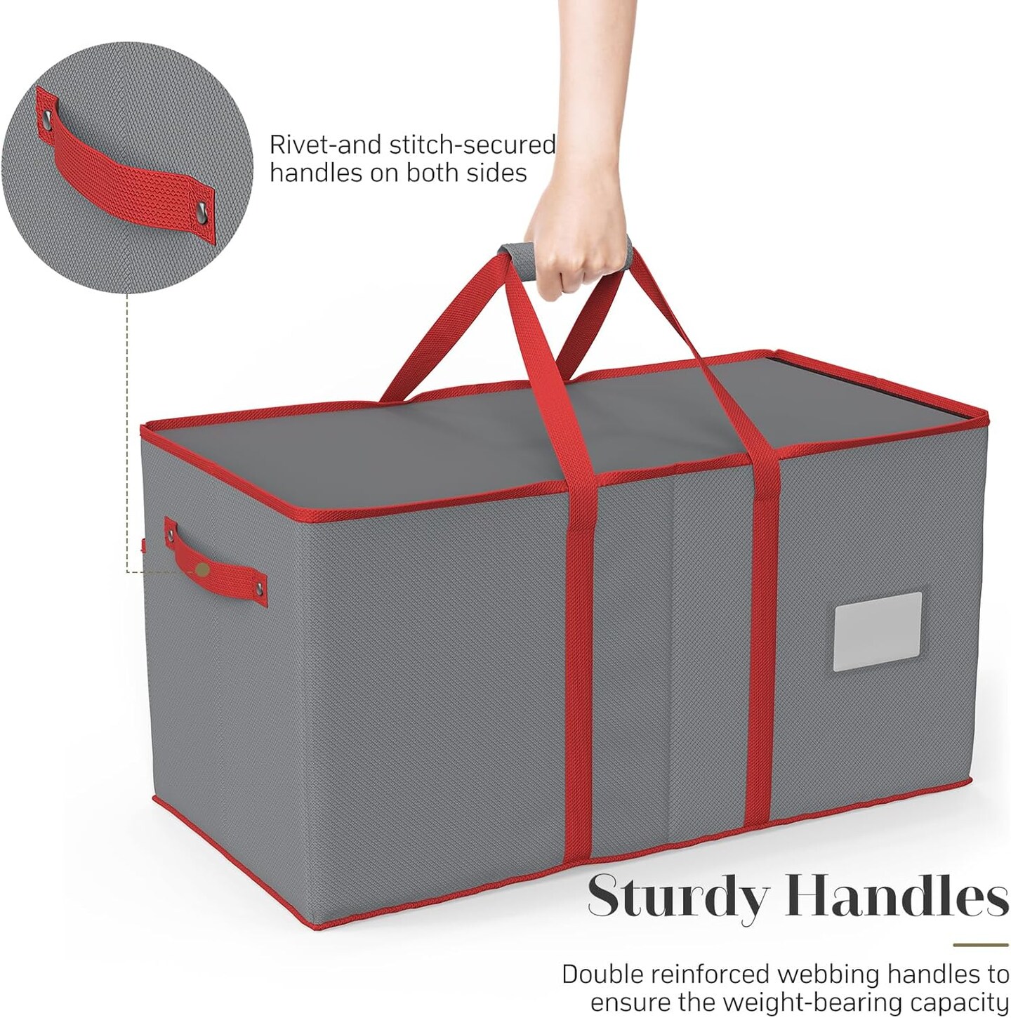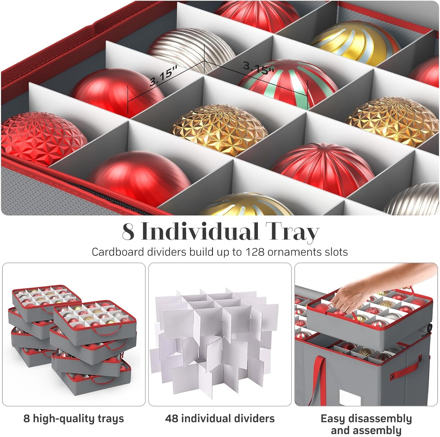 Christmas Ornament Storage Box with 8 Trays, Christmas Storage Containers Fit 128 Holiday Ornament Decorations, Large Xmas Organizer with Adjustable Dividers, Dual Zipper and Pockets (Grey)