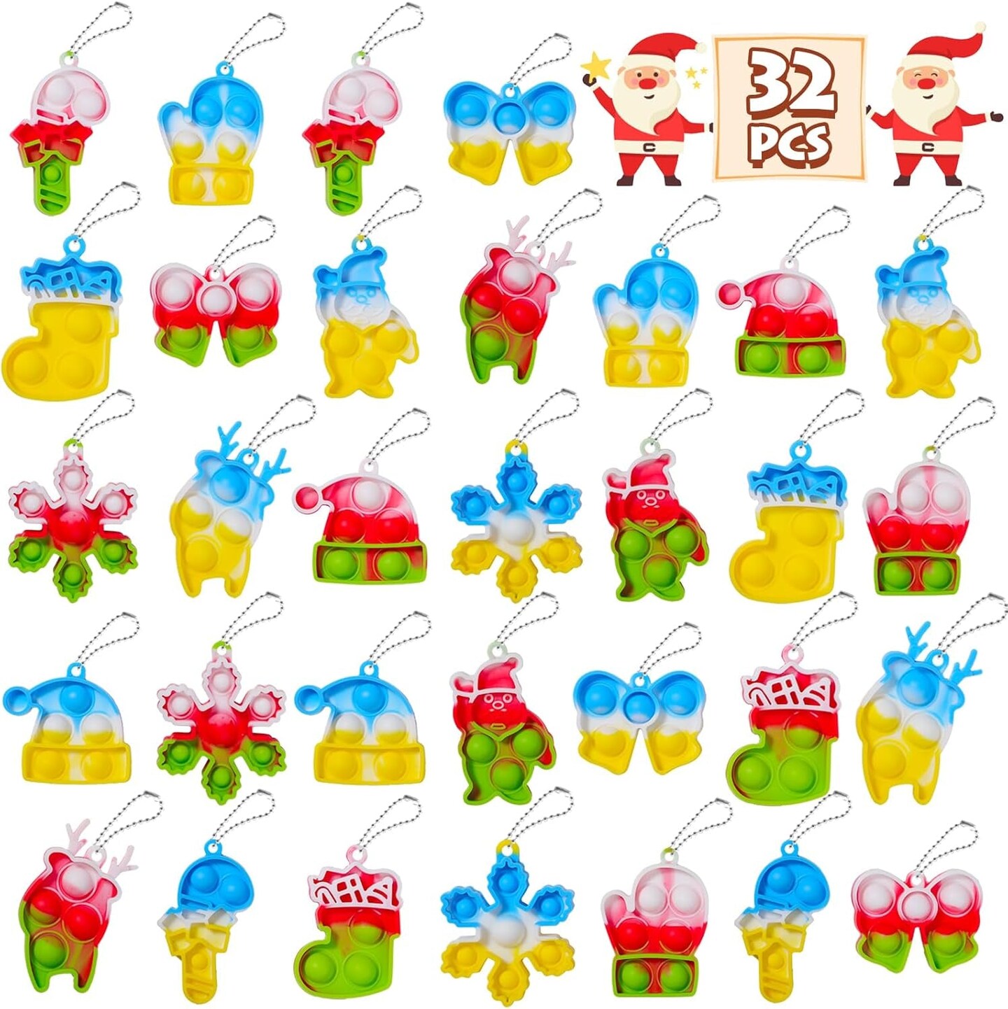 Christmas Party Favors for Kids: Mini Pop Keychain Toys Pack - Bubble Sensory Stocking Stuffers for Boys & Girls - Stress Relief Classroom Supplies Prizes Gifts - Goodie Bags Box(32Pcs