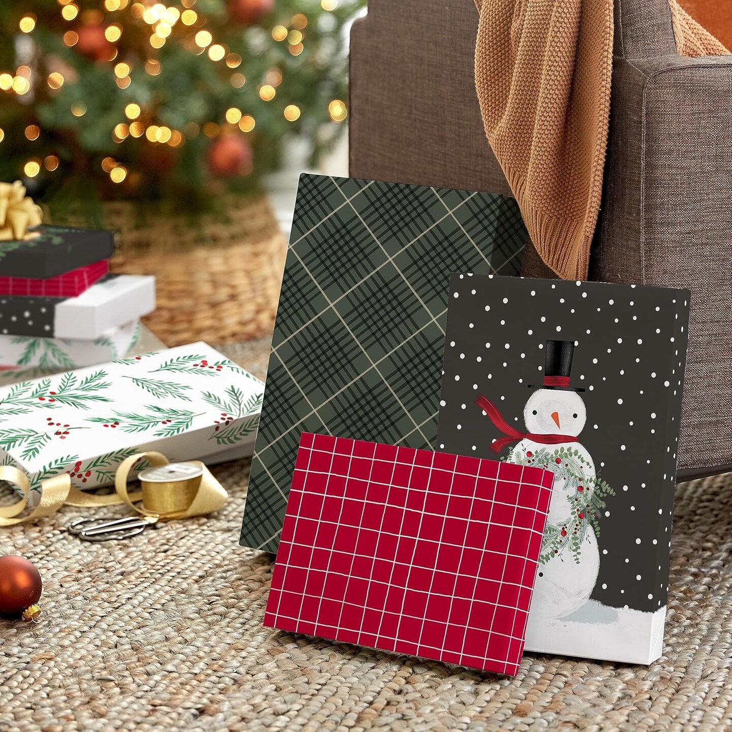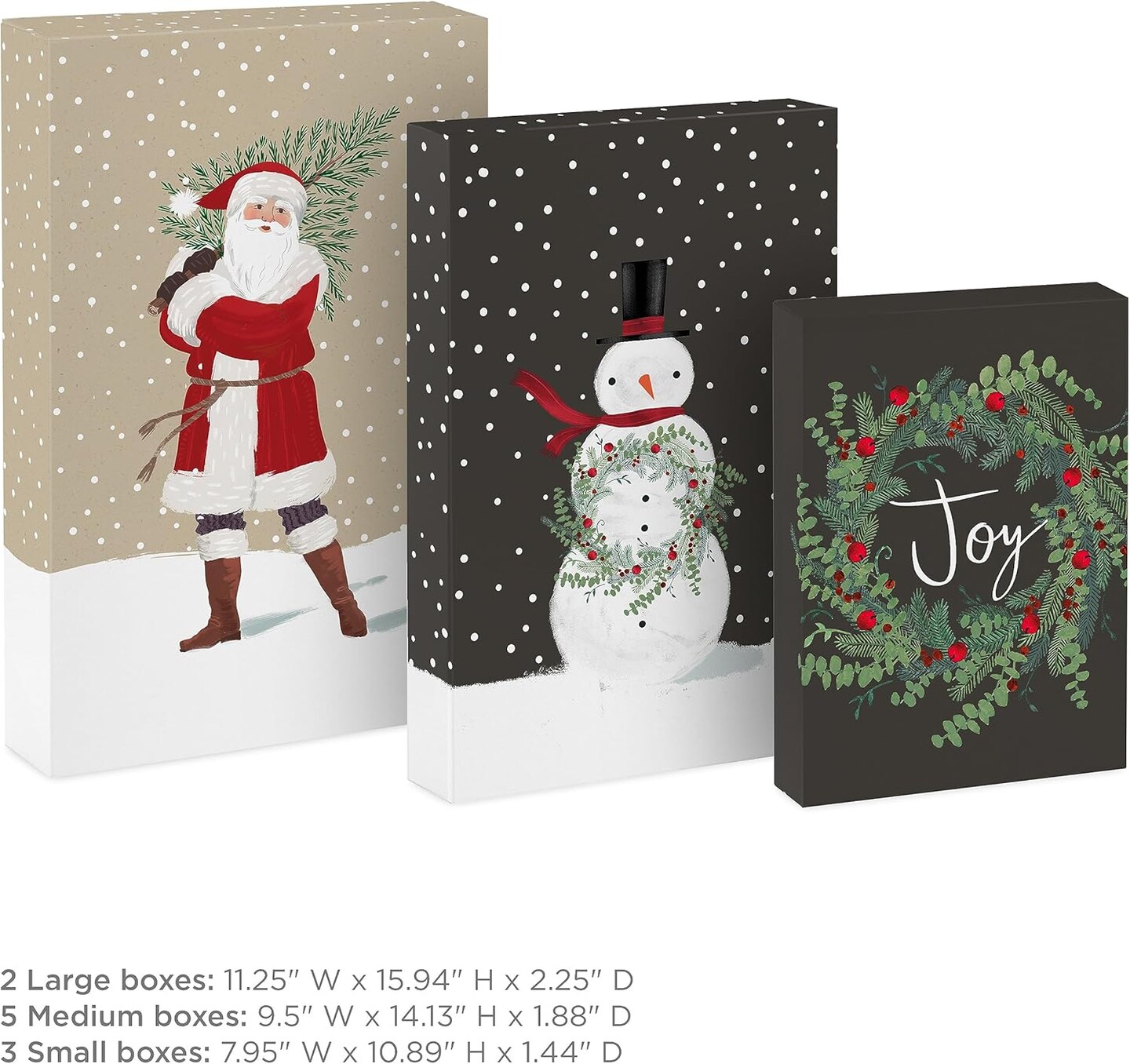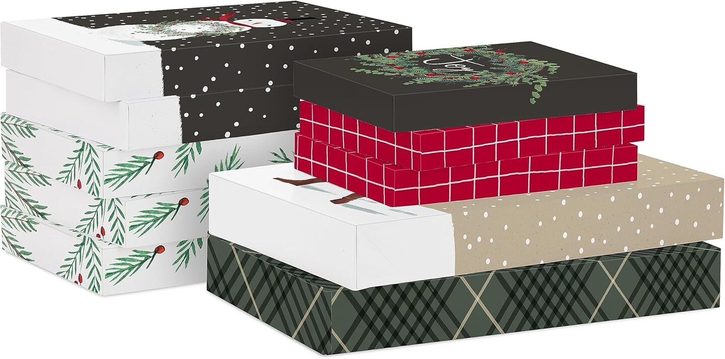 Christmas Shirt Boxes for Presents (10 Clothes Boxes with Lids: 3 Small 11", 5 Medium 14", 2 Large 16") Red, Green and Black Plaid, Snowmen, Santa, Winter Greenery