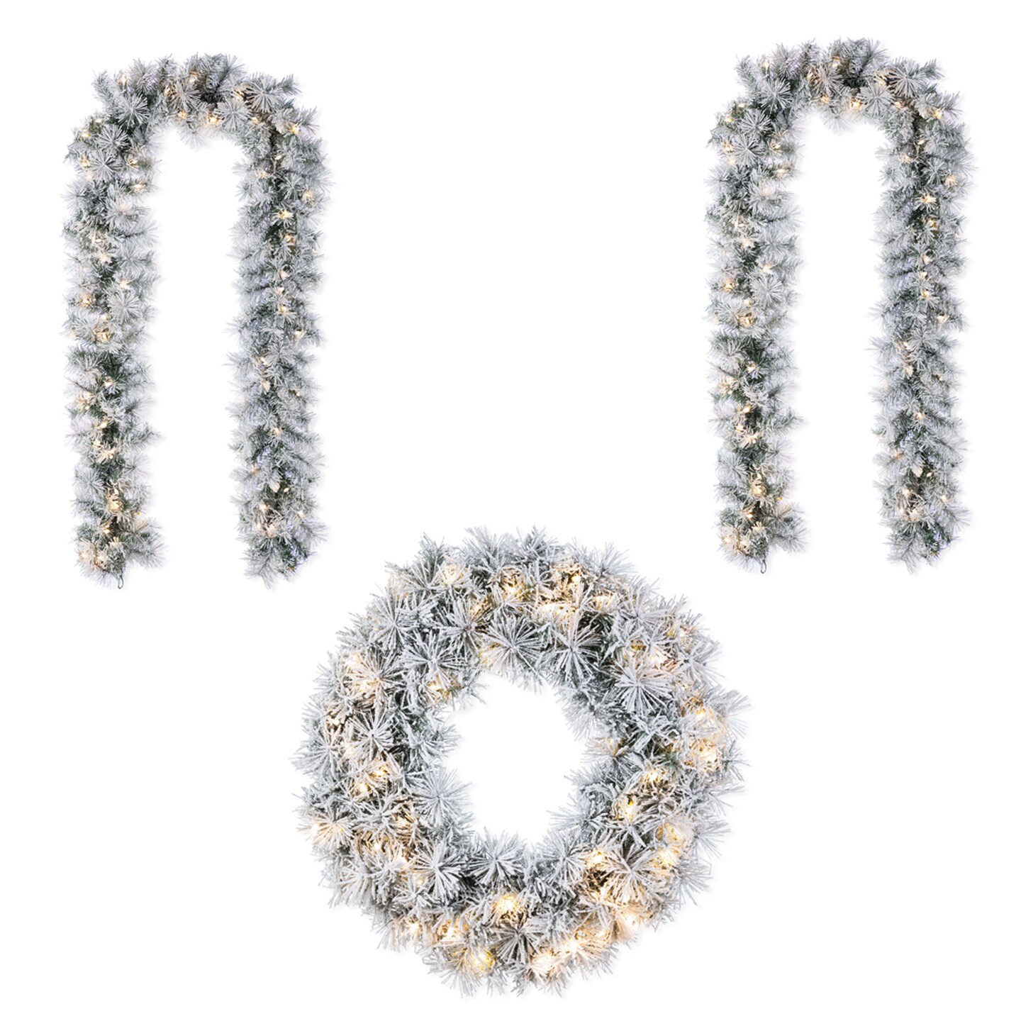 Christmas Snow Flocked Greenery Pine Garland & Wreath & Teardrop Set, with Warm White/Multi-color C3 Clear LED Lights and Timer,8 Function