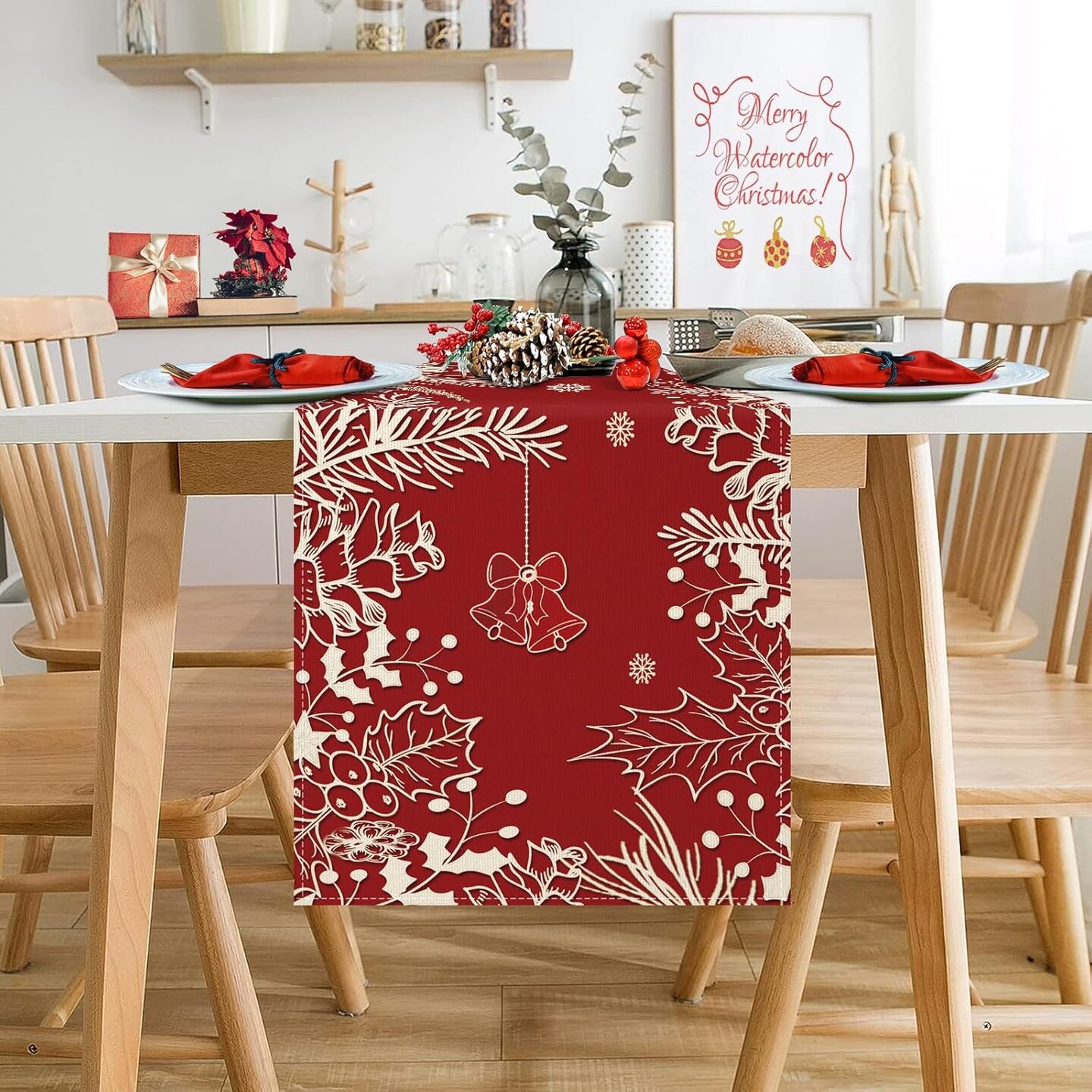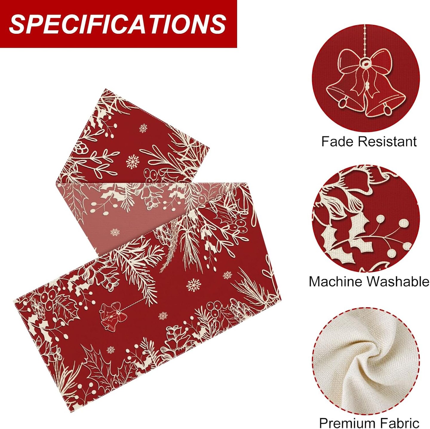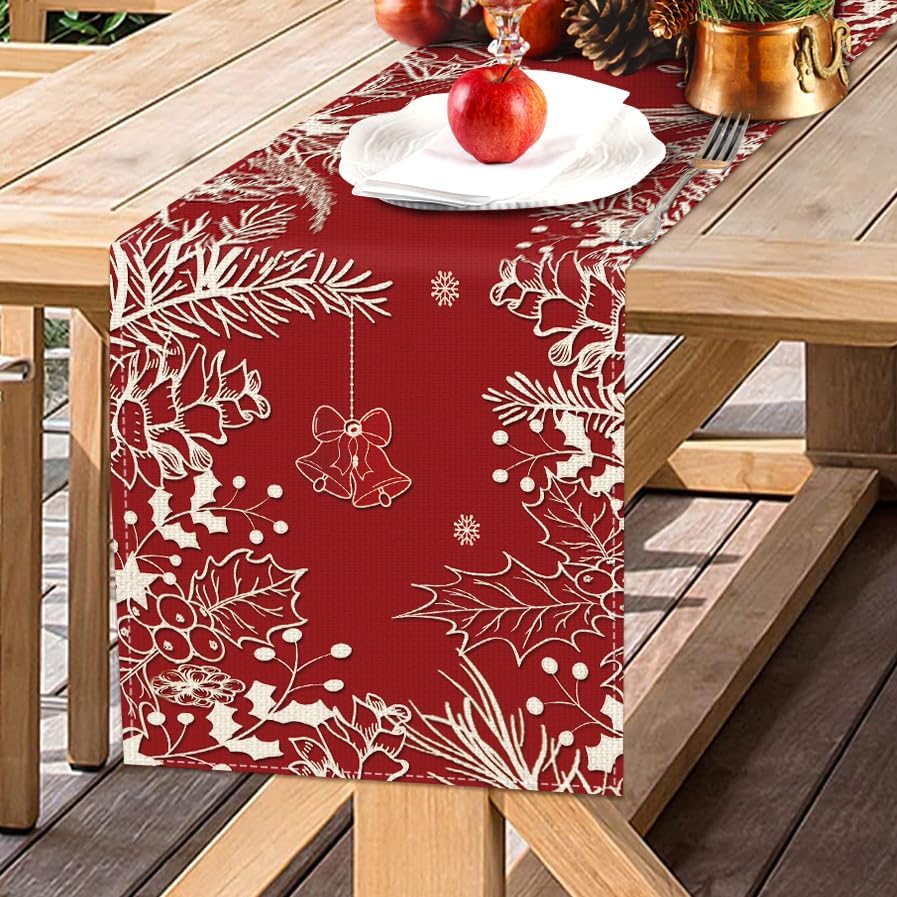 Christmas Table Runner Red Table Runner, Linen Holiday Table Runners 72 in Long, Holly Leaf Pine Cone Berry Christmas Runner for Table Dining Kitchen Party Rustic Christmas Decorations Indoor Home