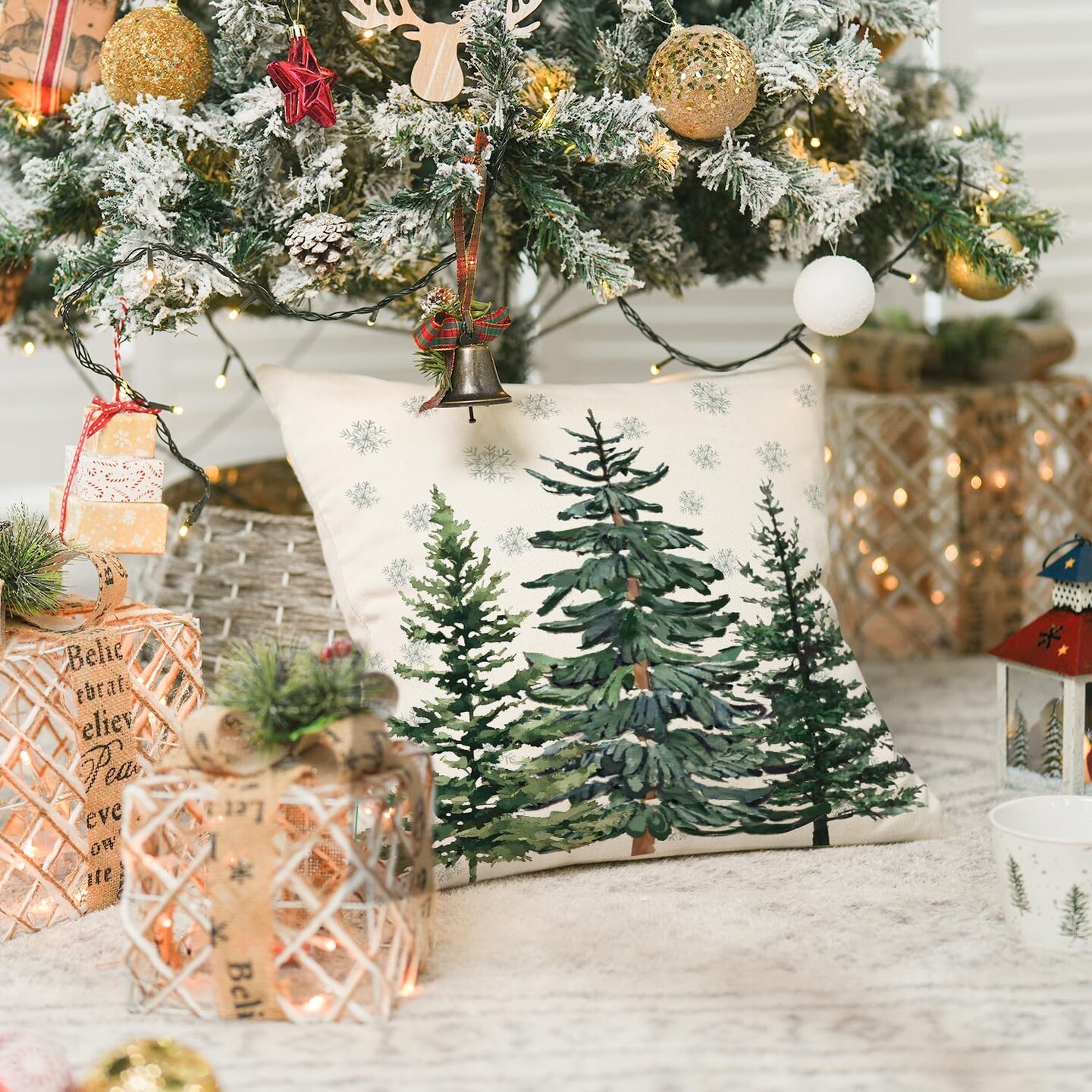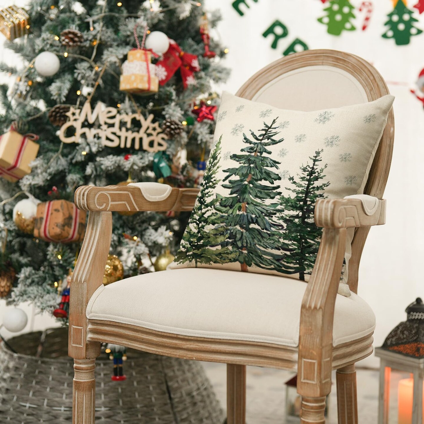 Christmas Trees Snowflake Throw Pillow Cover, 16 x 16 Inch Winter Holiday Cushion Case Decoration for Sofa Couch