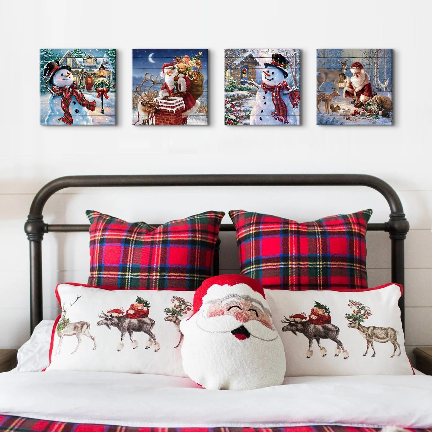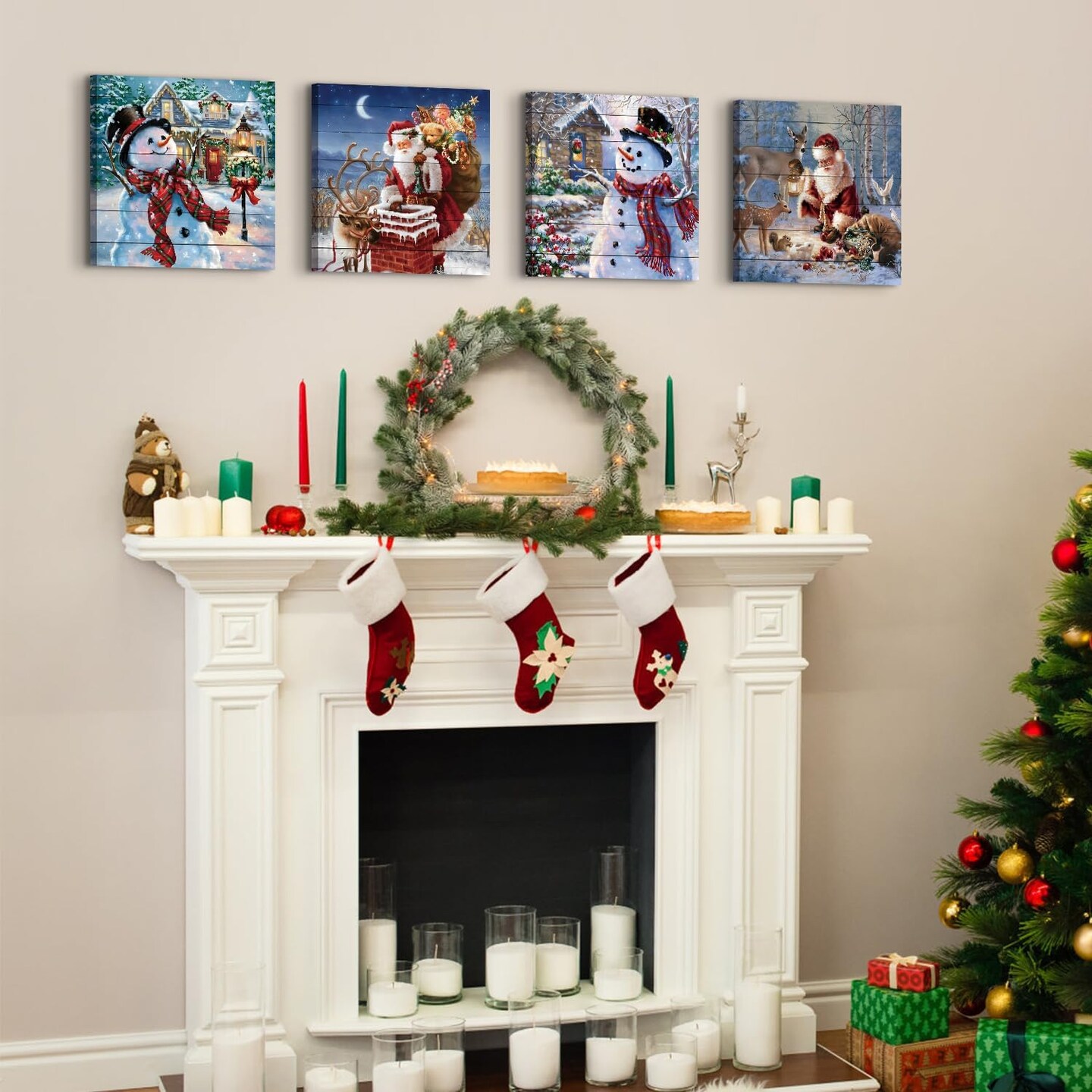 Christmas Wall Art Set – 4 Pcs Santa Claus & Snowman Canvas Prints – Watercolor Deer & Holiday Decor for Living Room, Bedroom, or Xmas Party