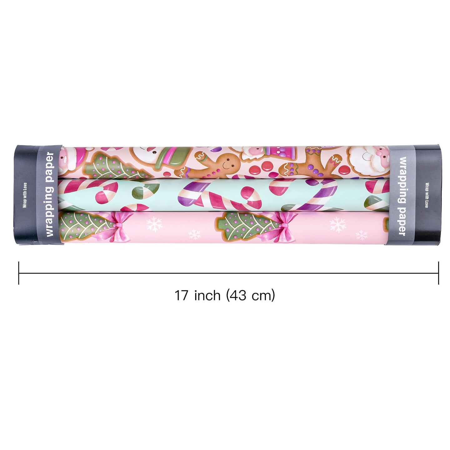 Christmas Wrapping Paper Roll - Mini Roll - 3 Rolls - 17 Inch x 120 Inch Per Roll - Pink & Blue Gingerbread Wrapping Paper Holiday Collection for Xmas Holiday, Party Celebration