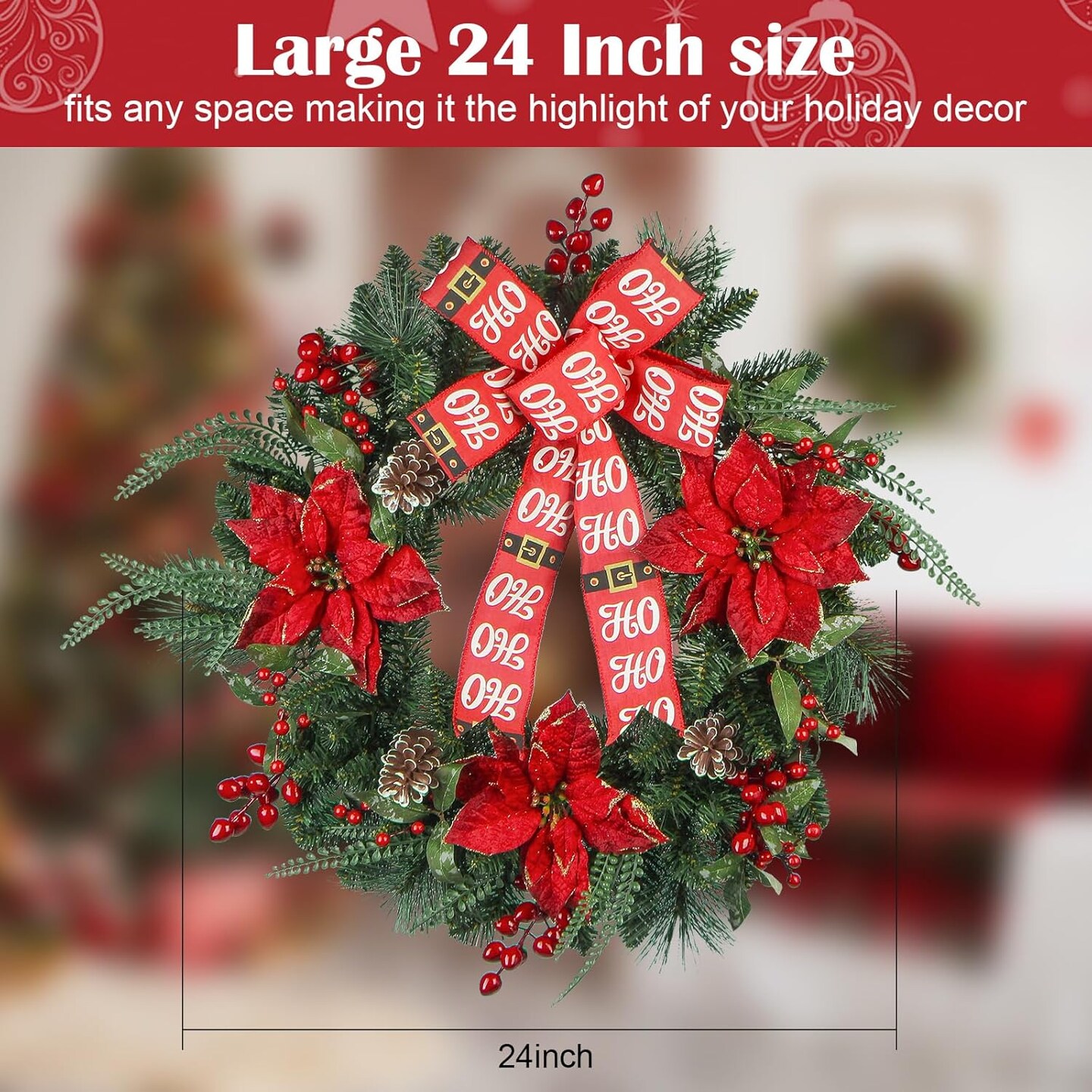 Christmas Wreath for Front Door 24 Inch Artificial Christmas Wreath with Pine Needles,Pinecones Red Berries Decorations Accents, for Decor Indoor/Outdoor Christmas Decoration