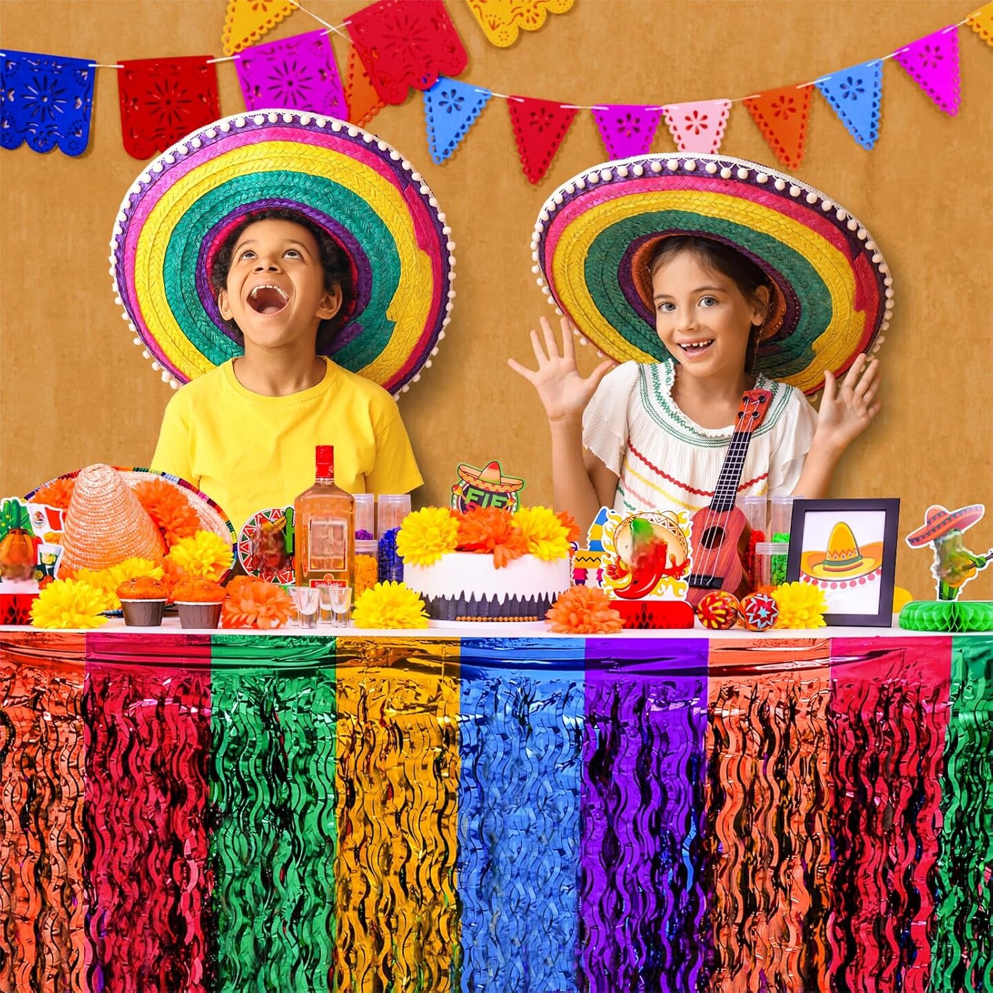 Cinco de Mayo Decorations, 2 Pack Fiesta Party Wavy Metallic Tinsel Foil Fringe Table Skirts, Perfect Mexican Themed Decors for Mexican Taco Dia De Los Muertos Birthday Party Table Bar Decor