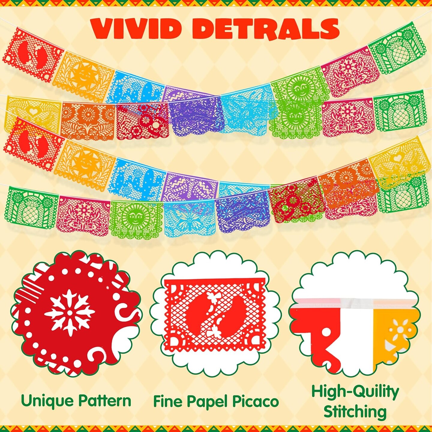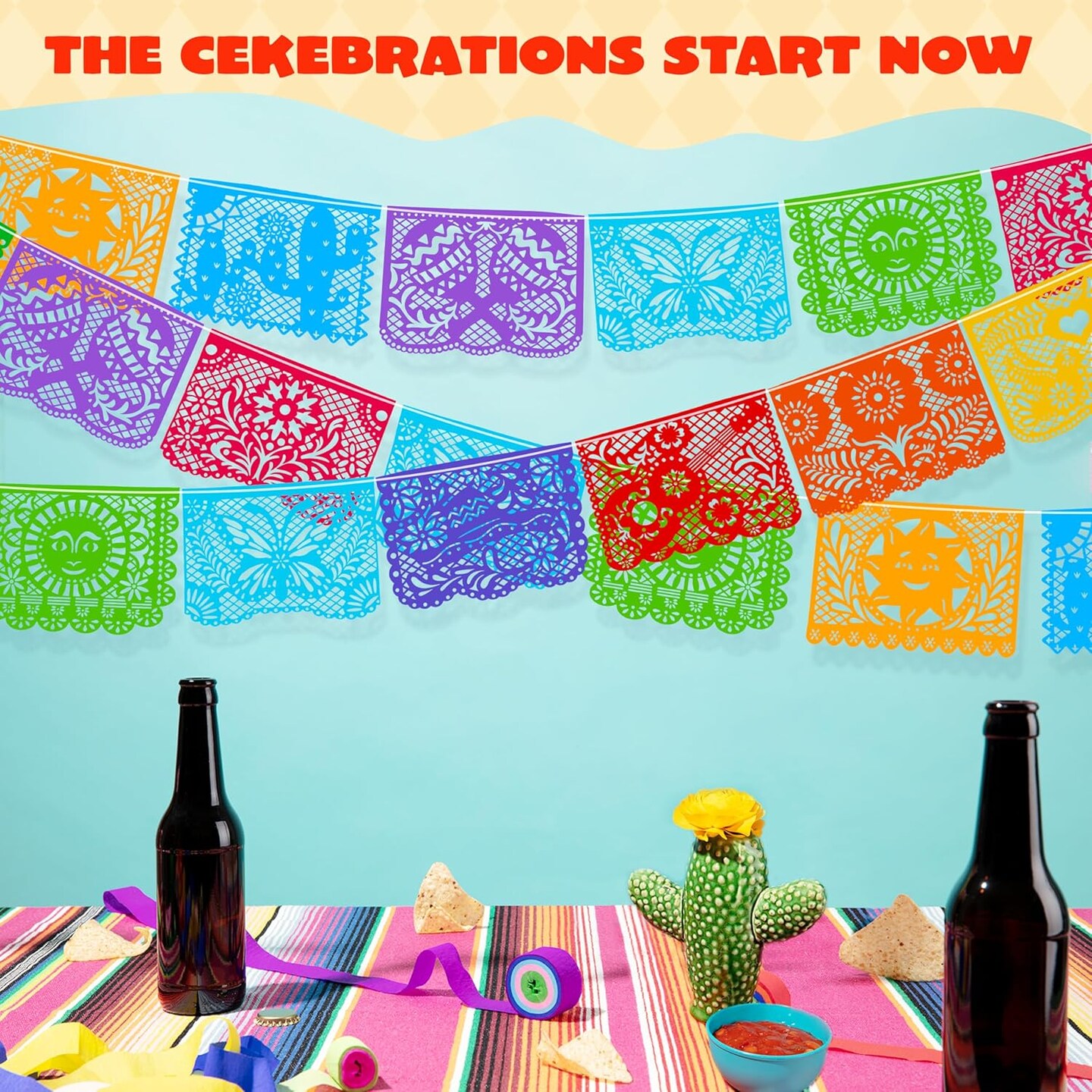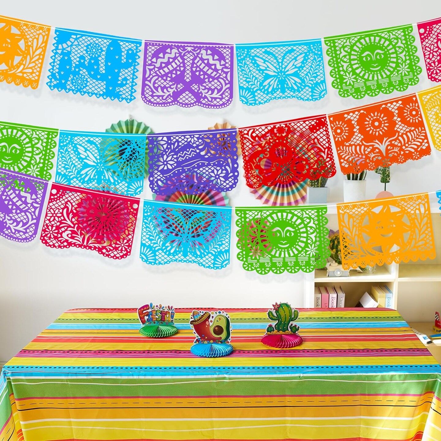 Cinco de Mayo Plastic Papel Picado Banner(4 pack with 8 Multicolor Plastic Flags per Banner), Mexican Party Banners for Fiesta Party Decorations, Dia Muertos Decor