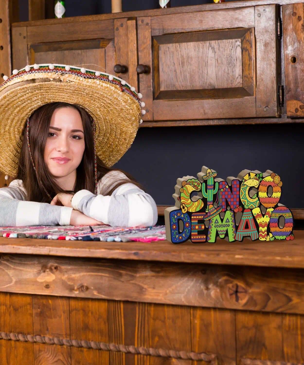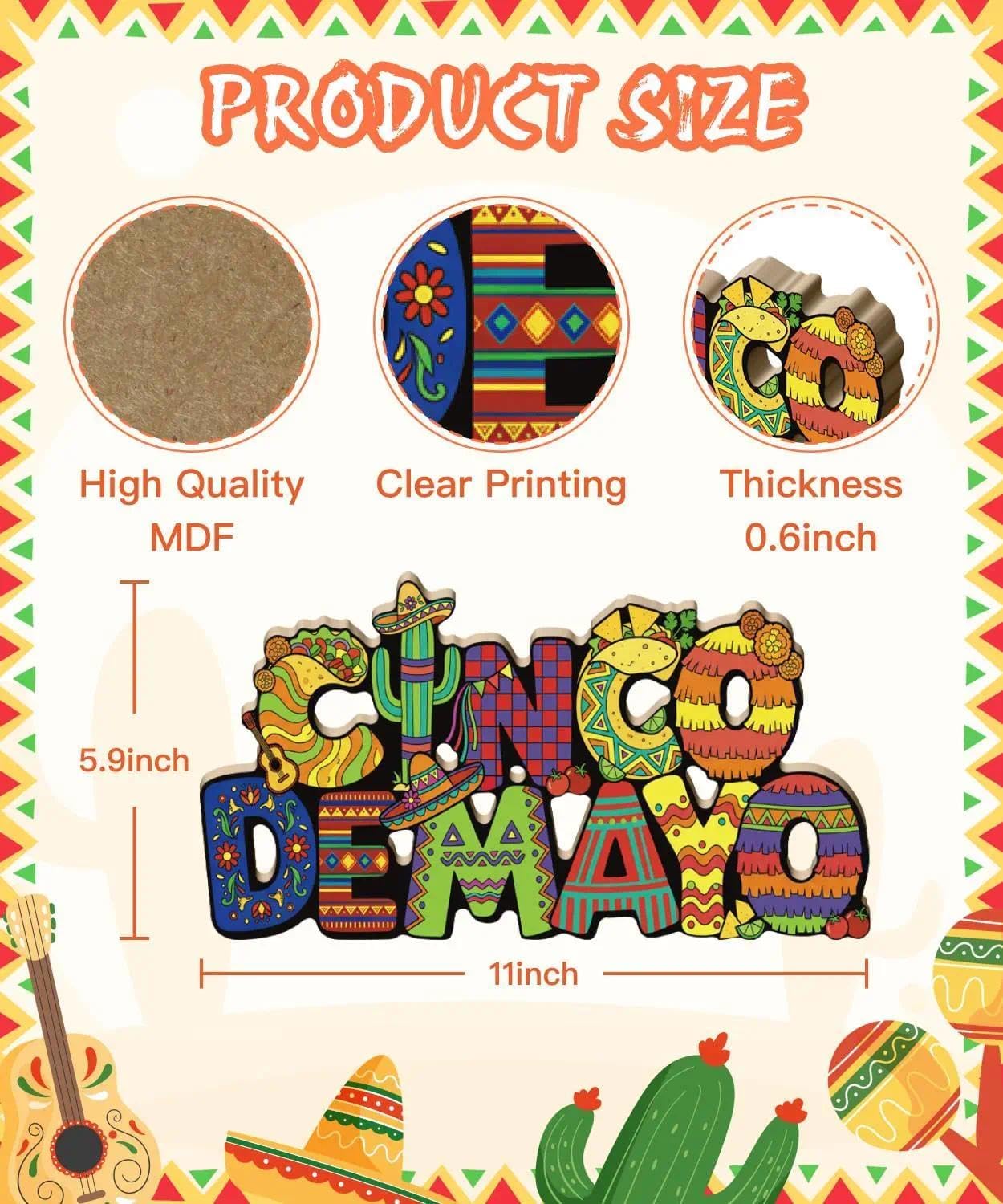 Cinco de Mayo Wooden Ornaments – Colorful “Cinco de Mayo” Letter Sign – Mexican Fiesta Table & Shelf Decor with Cactus, Sombrero, Guitar & Taco Designs – MDF Freestanding Party Decoration – Perfect for Mother's Day Card Making Displays