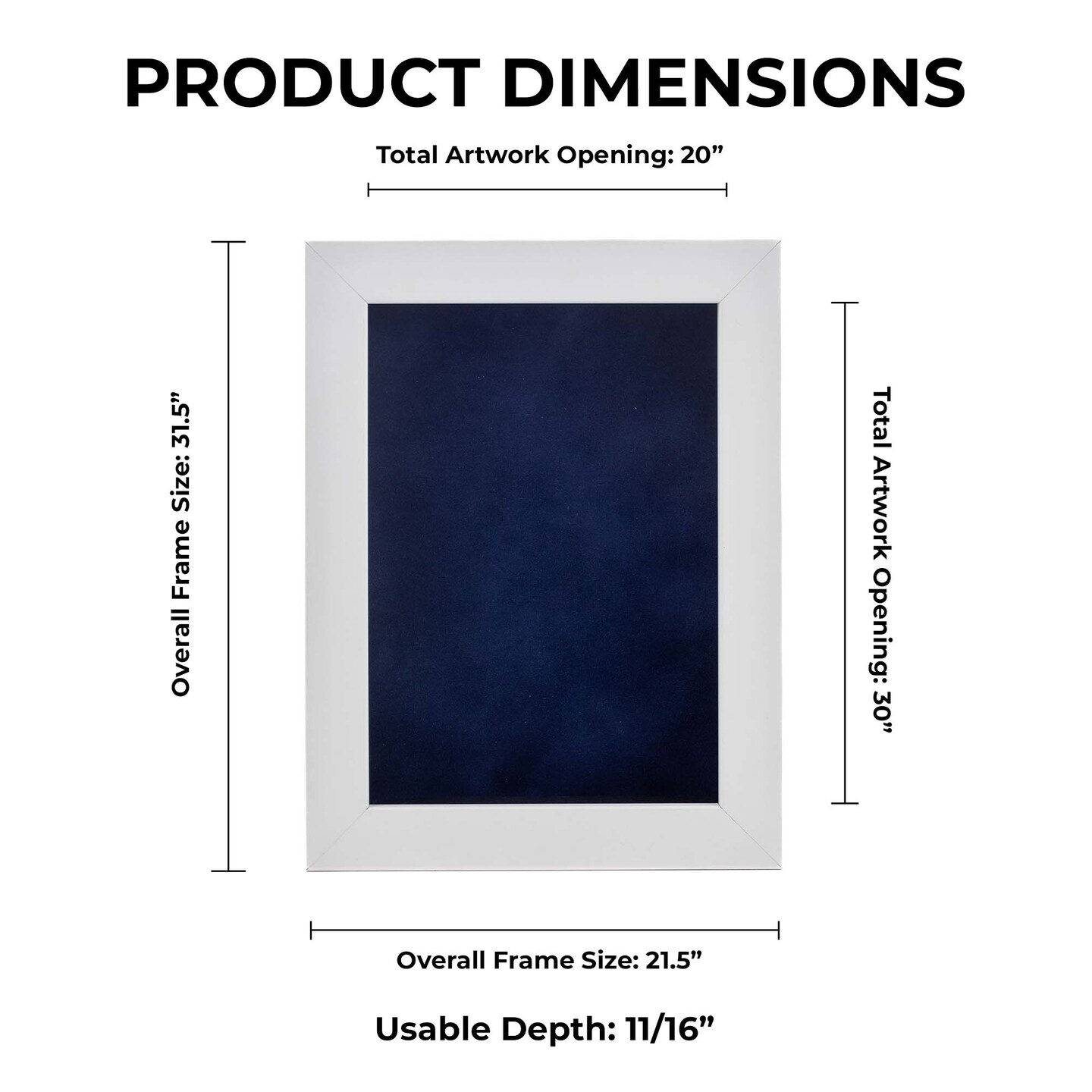 Classic White Wood Shadown Box Frame with Acrylic Front - Navy Blue Suede Backing, 30 Sizes