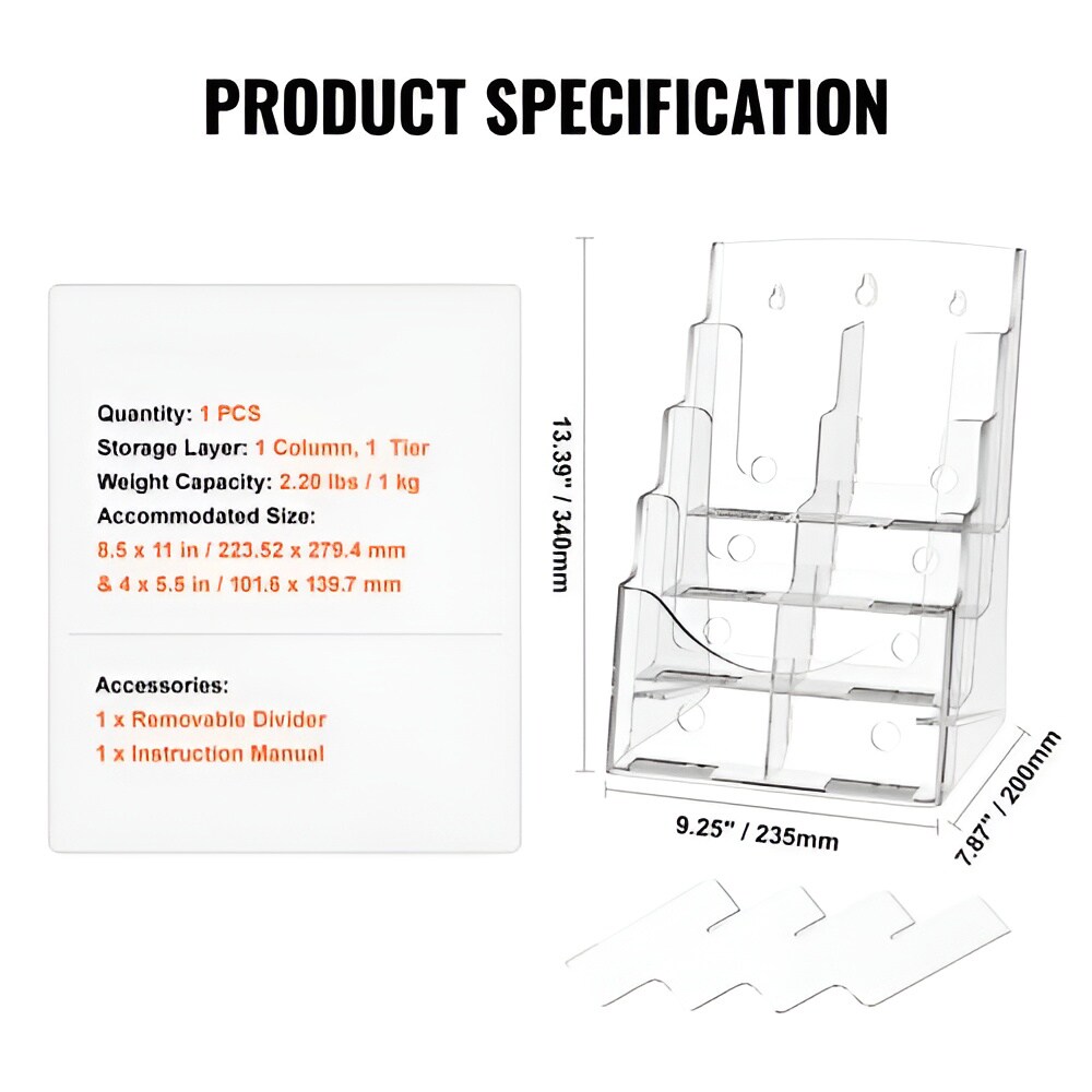 Clear Acrylic Brochure Holder 4-Pocket Display Stand with Removable Divider for Office