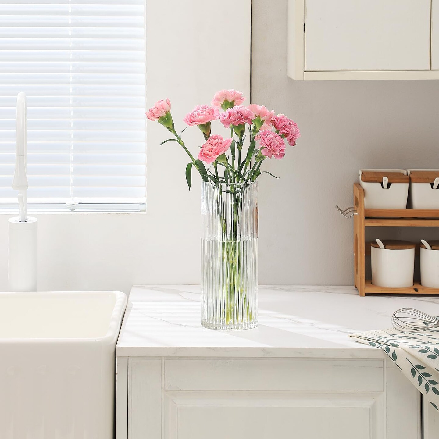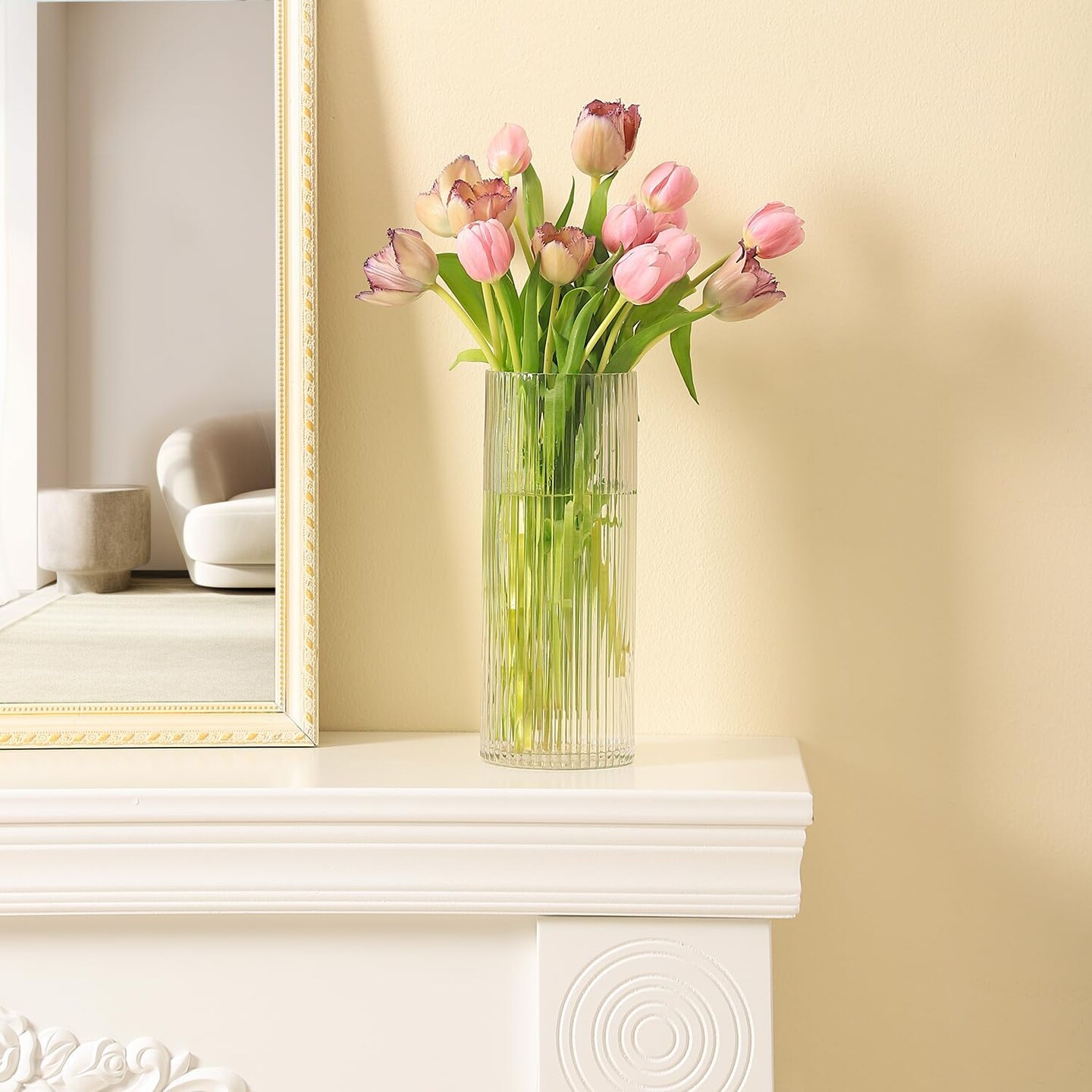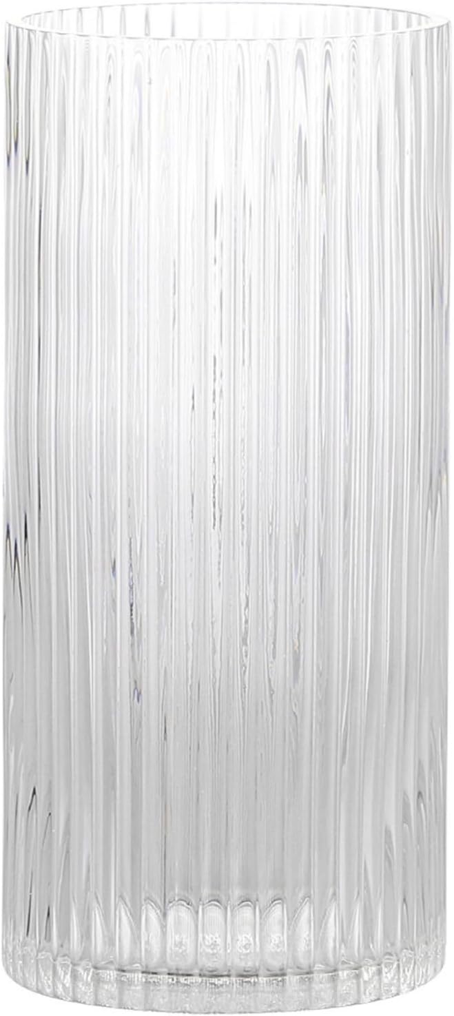 Clear Glass Vase, Glass Flower Vase, Ribbed Glass Vase, Clear Vase, Tall Cylinder Glass Vases for Centerpieces, Living Room, Dining Table, Office, Wedding, Bookshelf Decoration, 9.8 Inches