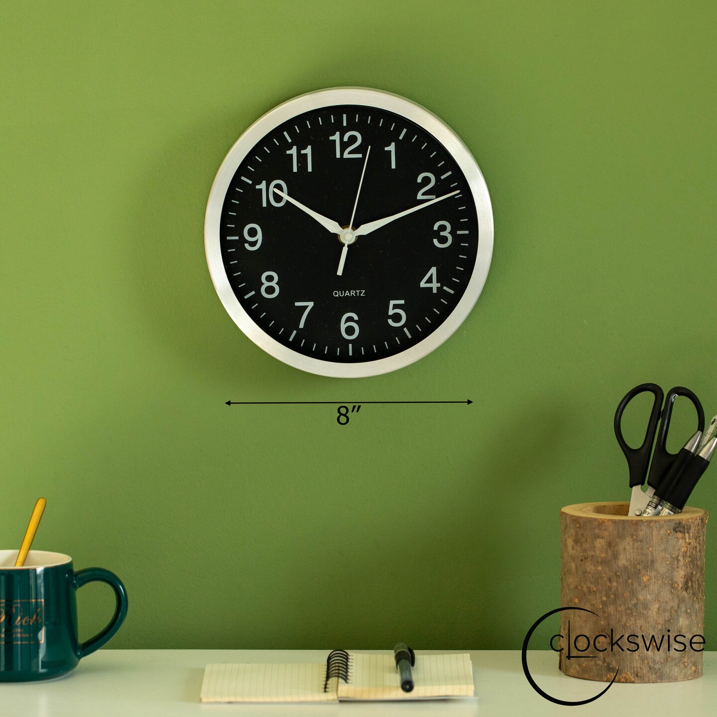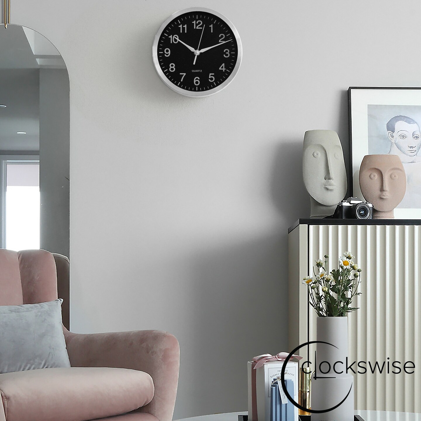 Clockswise Round Quartz Wall Clock Non-Ticking Battery Operated with Silent Sweep Movement, Aluminum Silver Frame, Perfect for Home Kitchen Office Living Room Study Hallway Classroom, Black Face