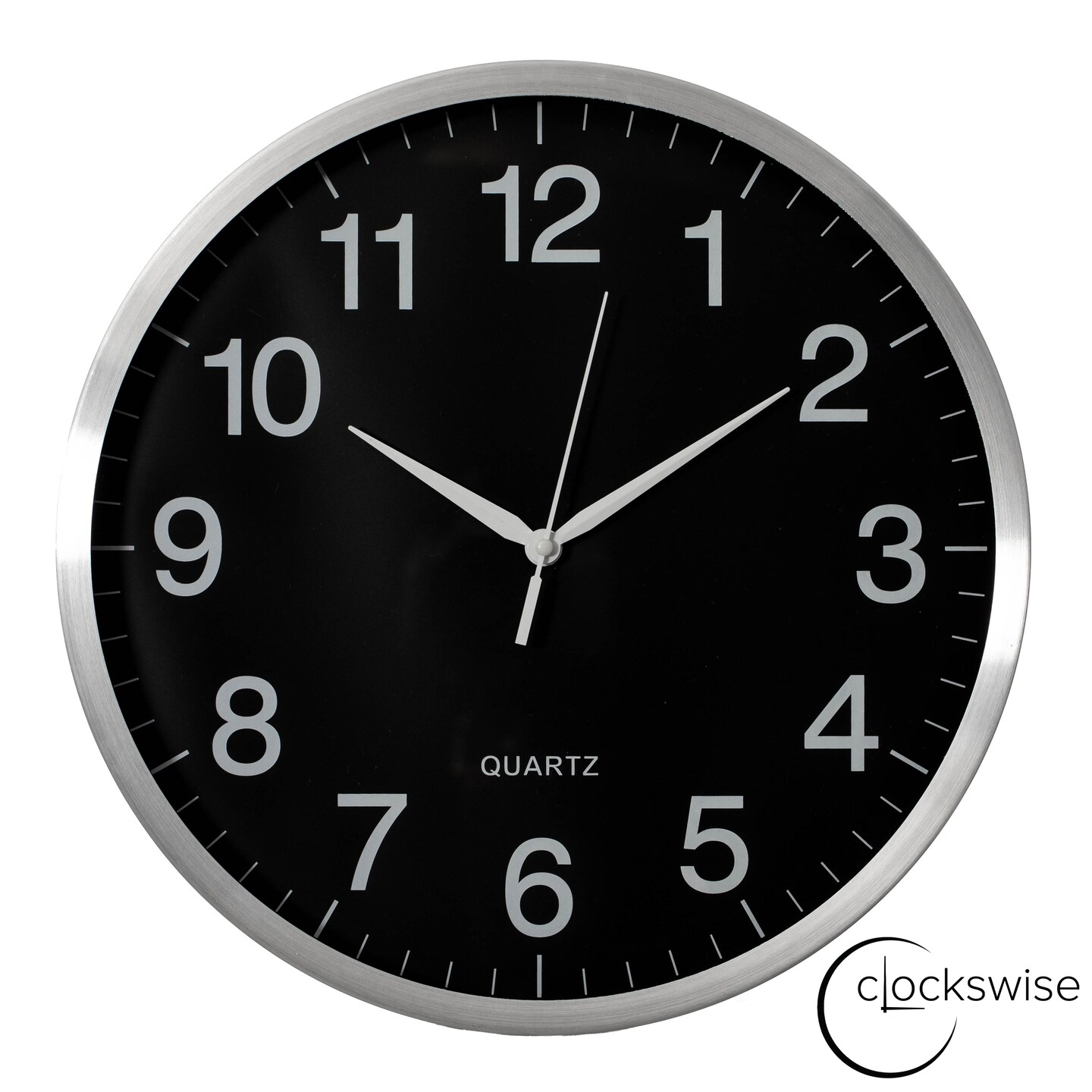 Clockswise Round Quartz Wall Clock Non-Ticking Battery Operated with Silent Sweep Movement, Aluminum Silver Frame, Perfect for Home Kitchen Office Living Room Study Hallway Classroom, Black Face