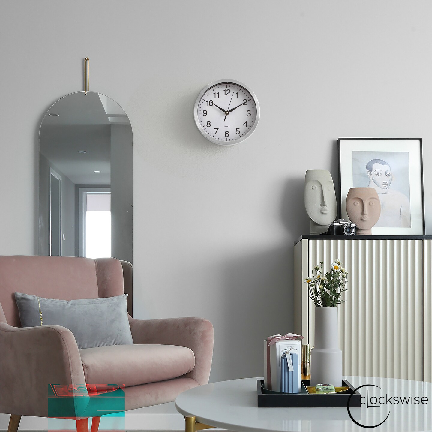 Clockswise Round Quartz Wall Clock Non-Ticking Battery Operated with Silent Sweep Movement, Aluminum Silver Frame, Perfect for Home Kitchen Office Living Room Study Hallway Classroom, Black Face