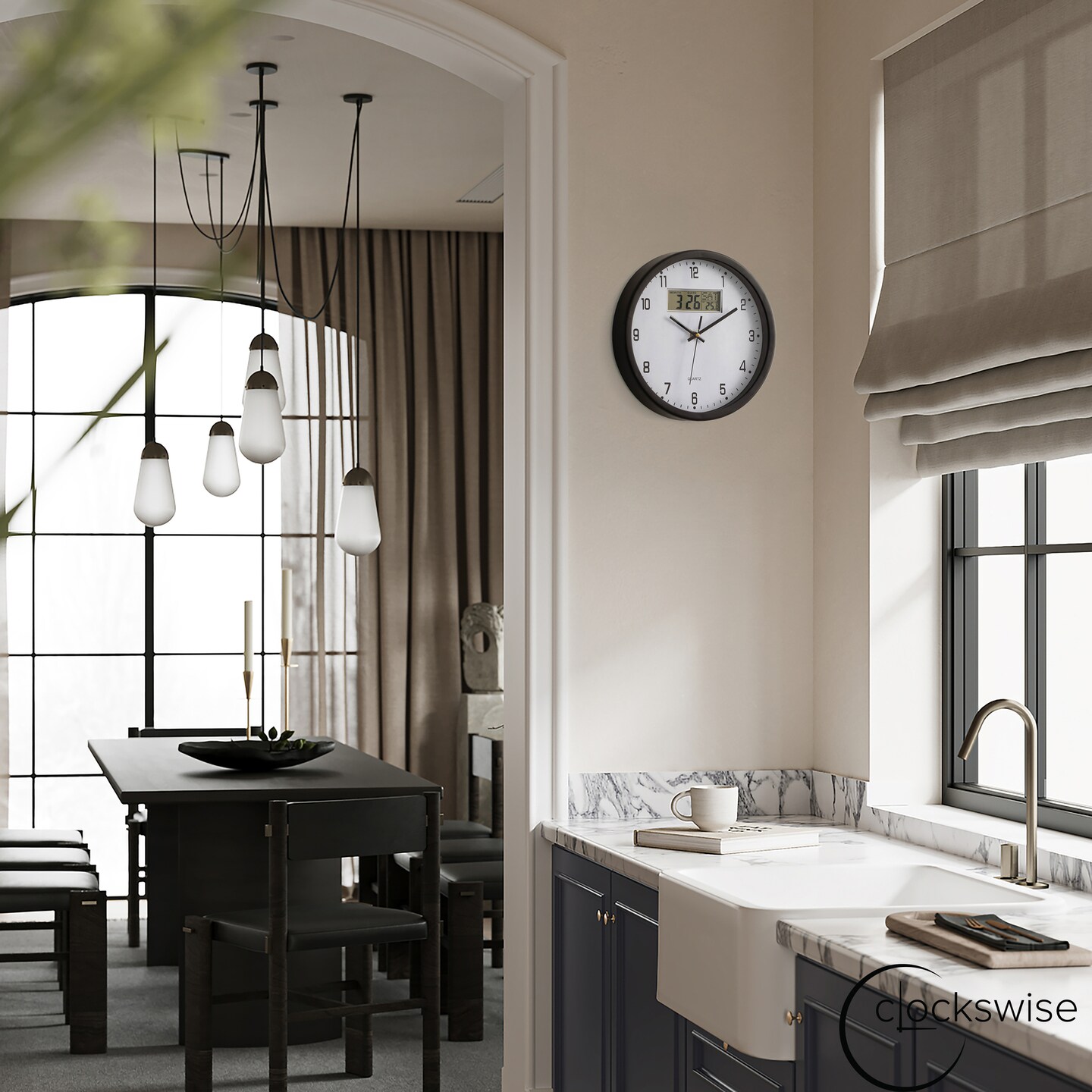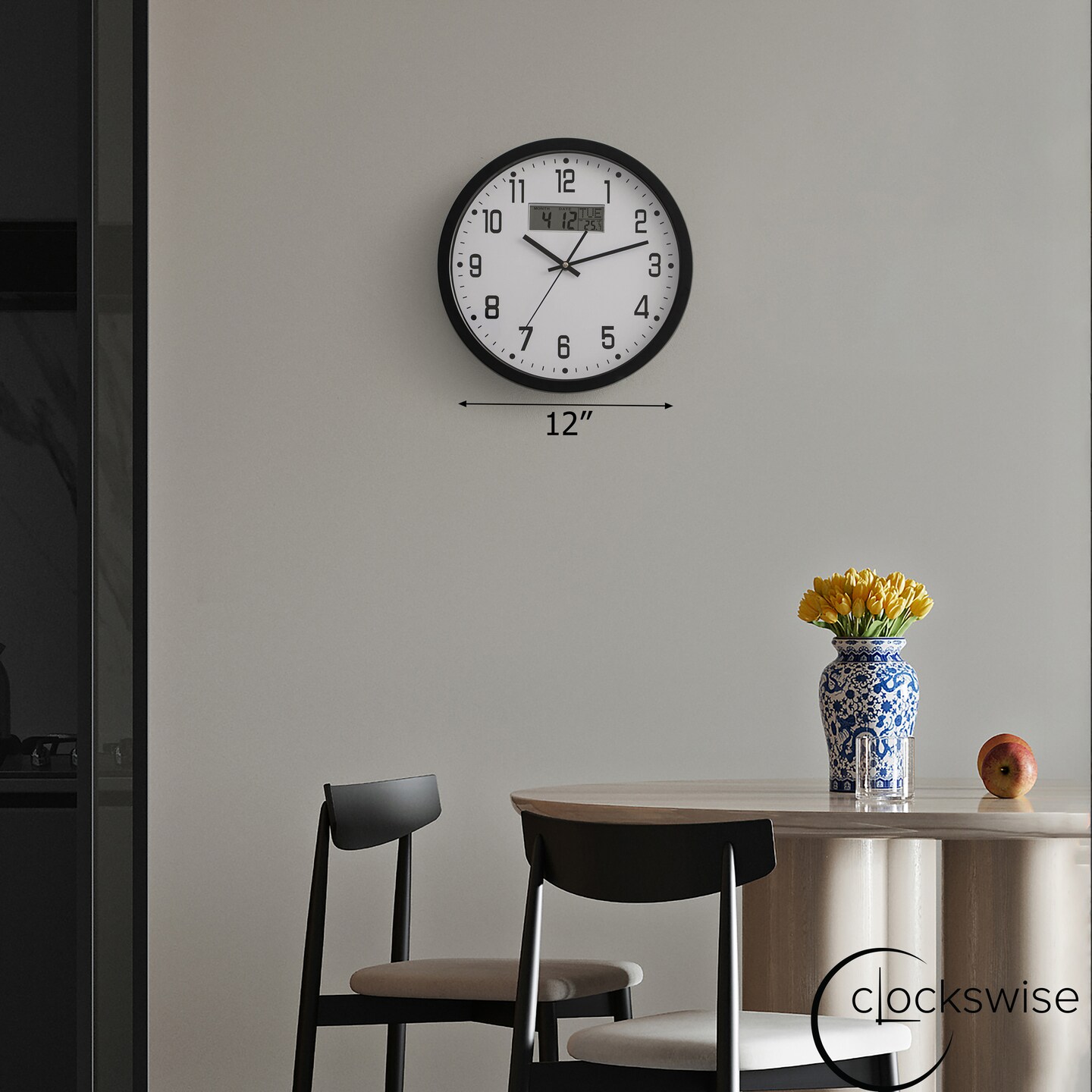 Clockswise Wall Clock, Non-Ticking Analog & Digital with Temperature Display Battery Powered, Silent Operation, Switchable Time and Date - Perfect for Classroom Office Bedroom and Study, Black