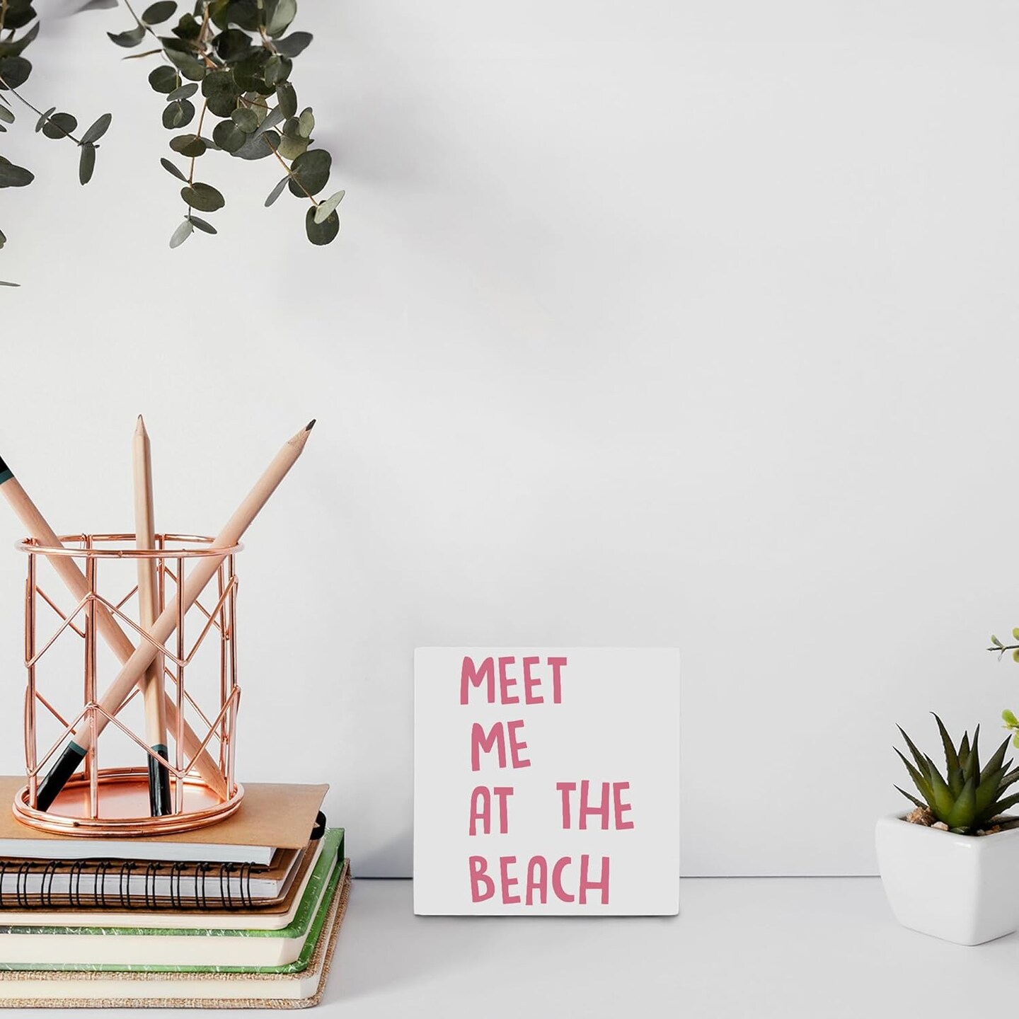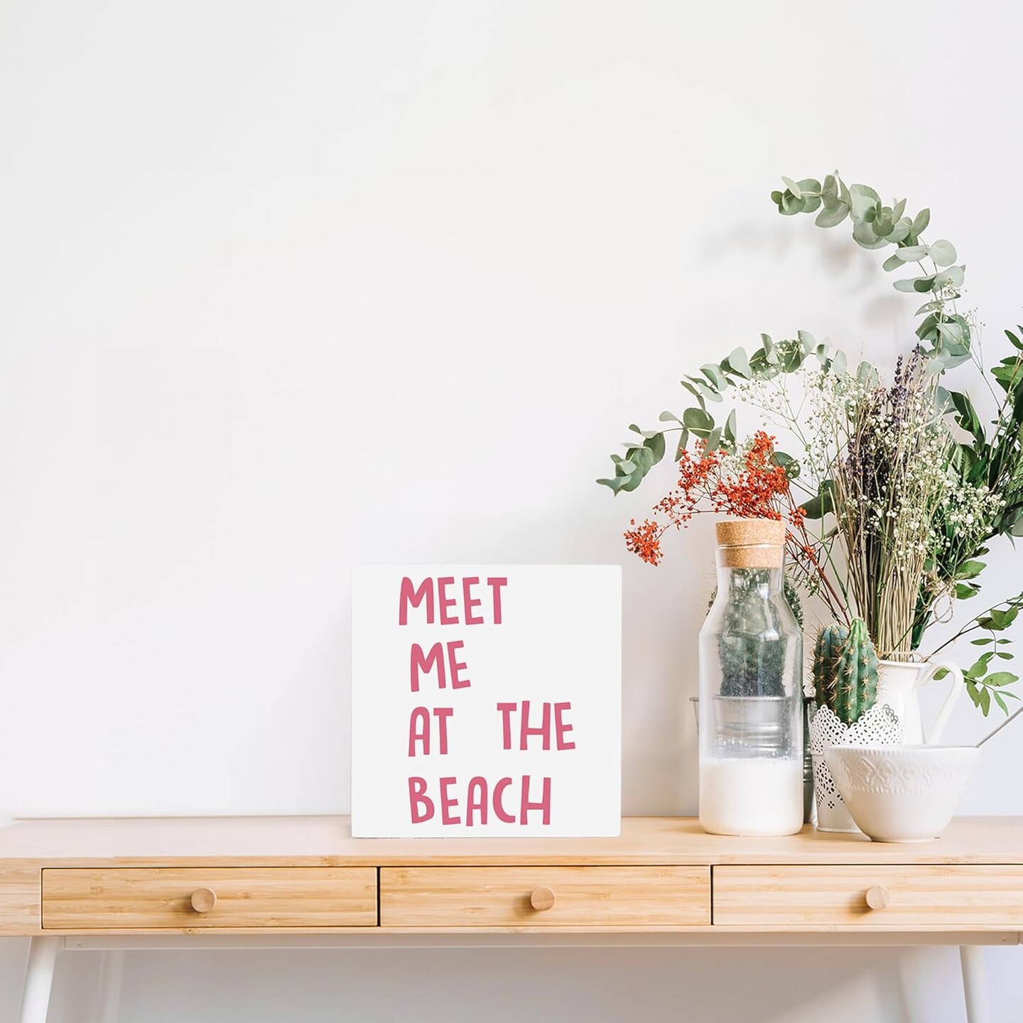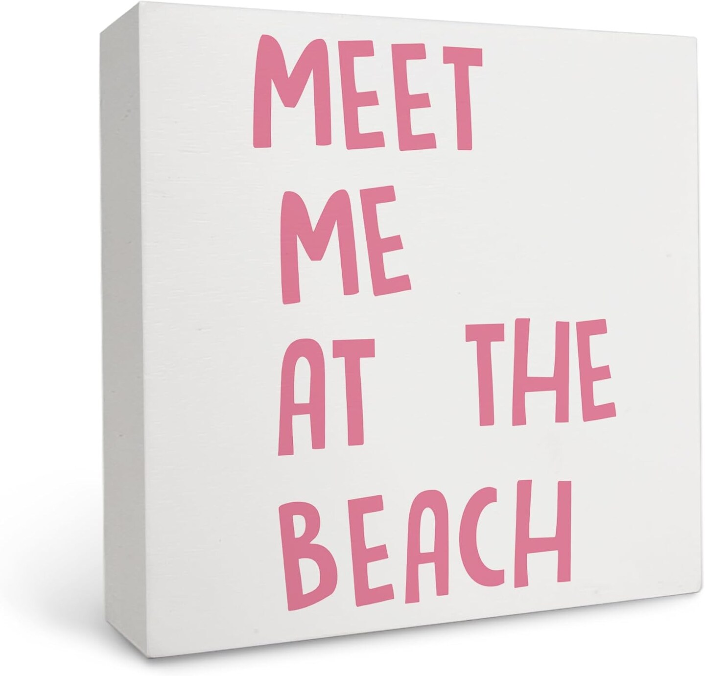 Coastal Beach Wooden Box Sign - Pink Shelf Desk Decor Wooden Box, Summer Beach Decorations for Home Coastal, Pink Shelf Decor Aesthetic Wooden Box 5x5 Inches