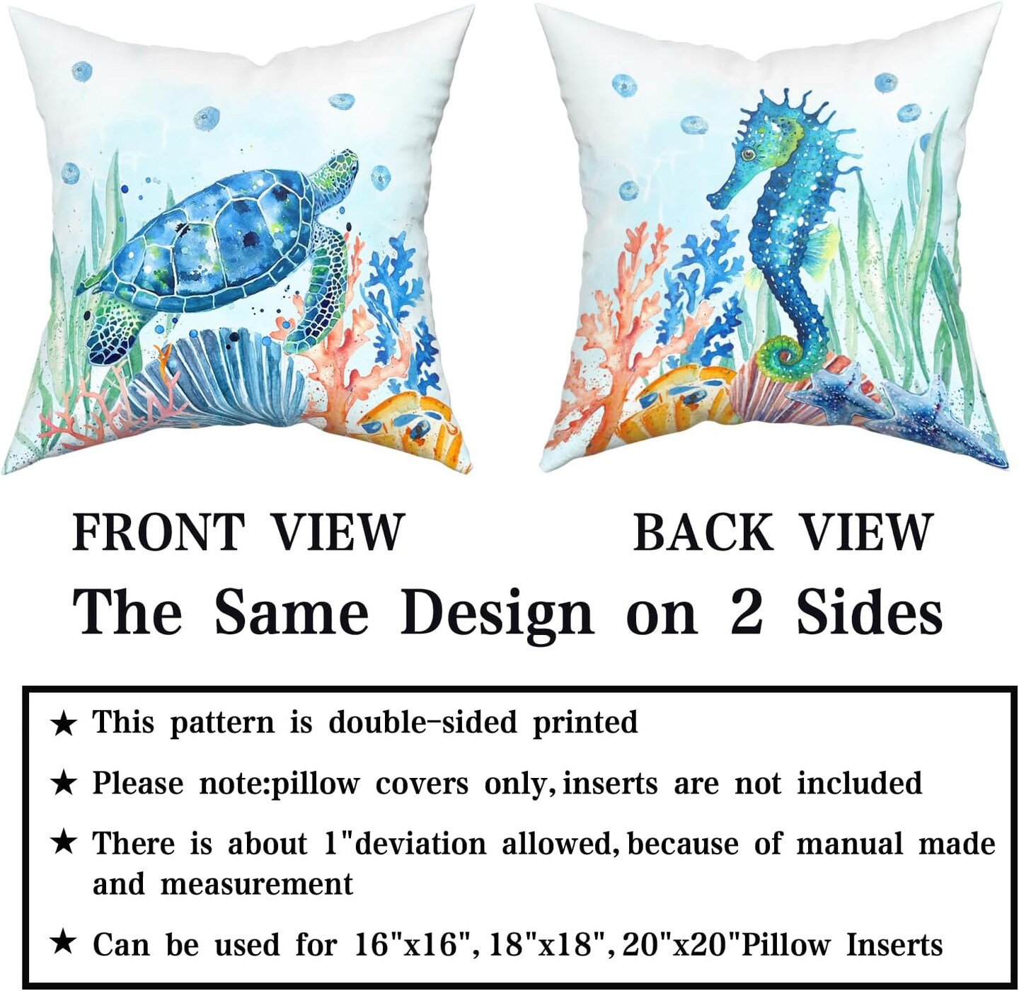 Coastal Ocean Pillow Covers Set of 2-18"x18" Sea Turtles Seahorse Decorative Throw Pillow Cases- Watercolor Marine Animals Double Sided Square Cushion Covers for Sofa Couch Bed Car