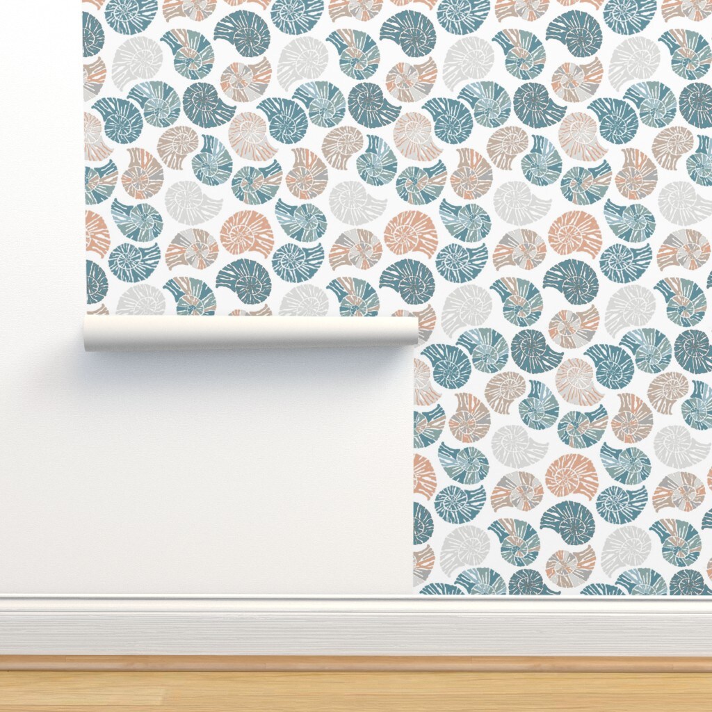 Coastal Shells Beach Blue Terra Cotta Seashells Nautical Custom Removable Wallpaper by Spoonflower Peel & Stick Wallpaper 2FT Wide