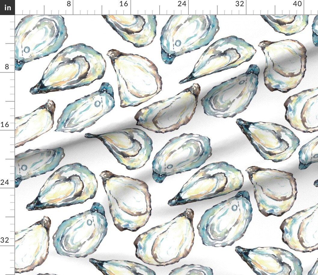 Coastal Watercolor Oyster Shells Large Scale Ocean Life Seashell White Blue Yellow Soft Pastel Modern Nautical Custom Printed Fabric by Spoonflower Various Fabrics by the Yard or Fat Quarter
