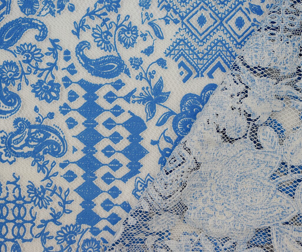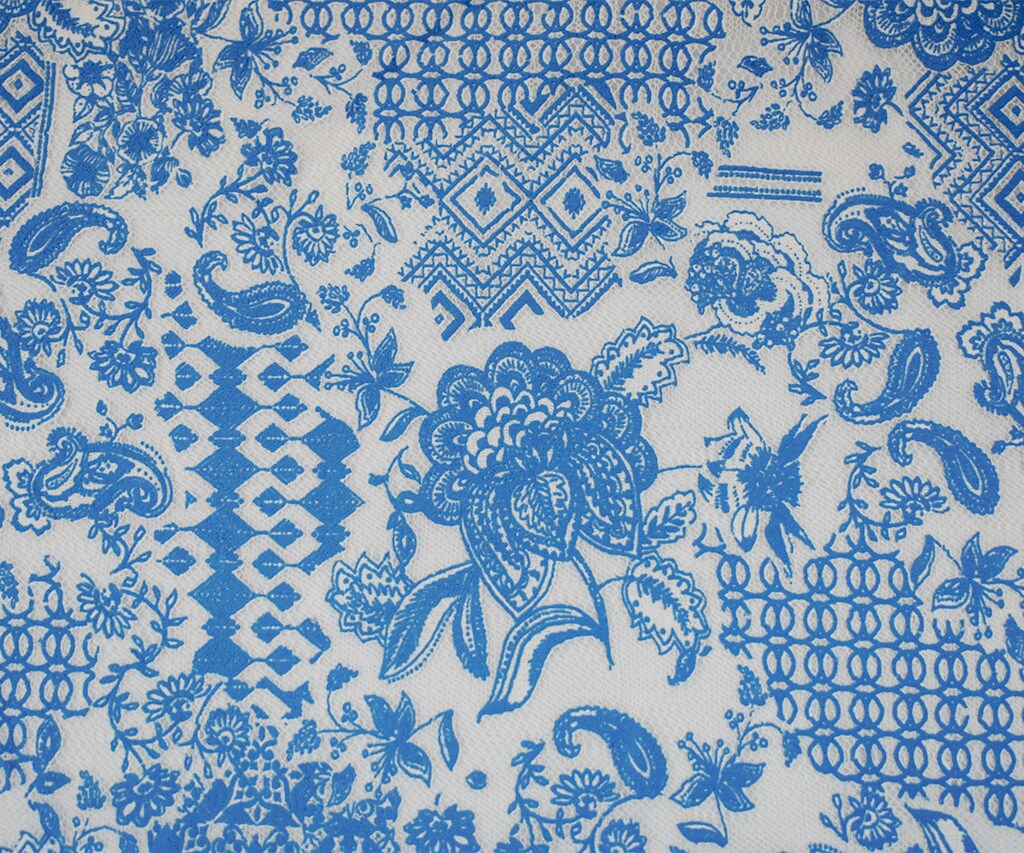 Cobalt Blue-White Poly Cotton Floral Multi Pattern Lace Mesh Knit Fabric By the Yard