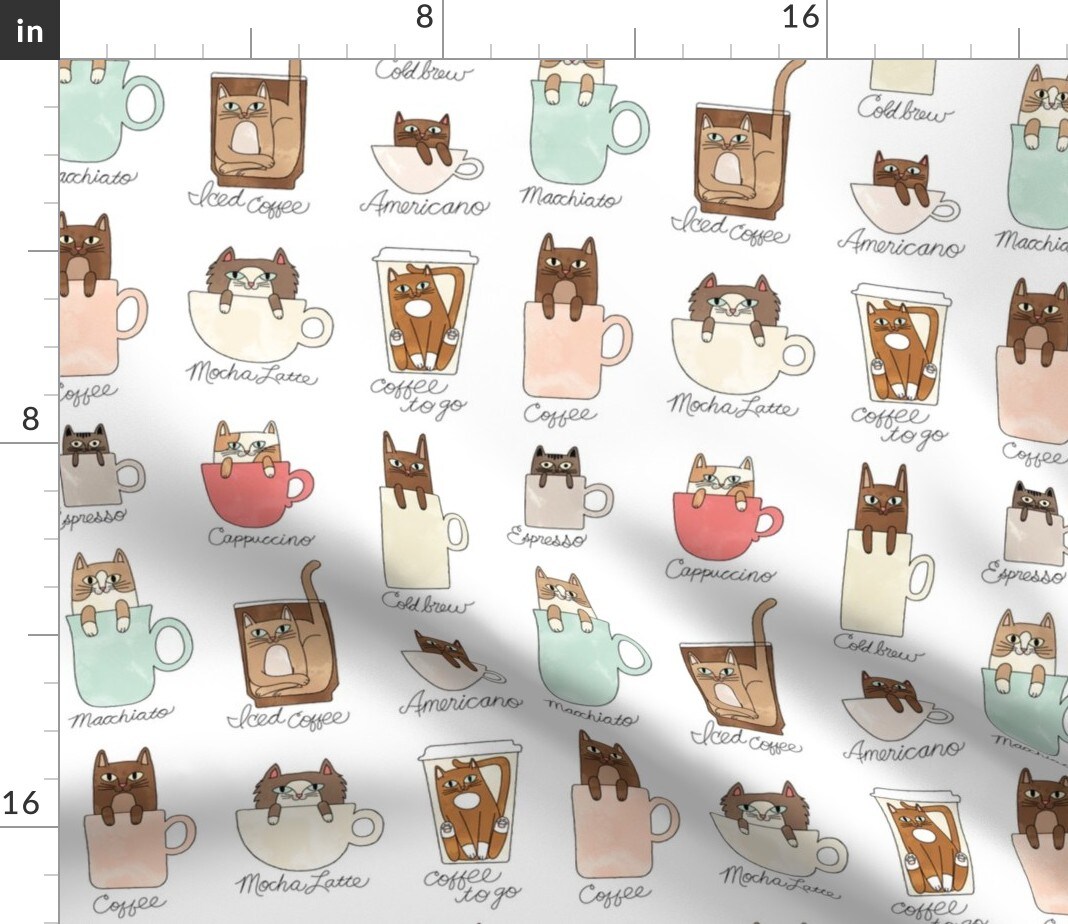 Coffee Cats Pets Funny Watercolor Cat Kitty Latte Espresso Custom Printed Fabric by Spoonflower Various Fabrics by the Yard or Fat Quarter