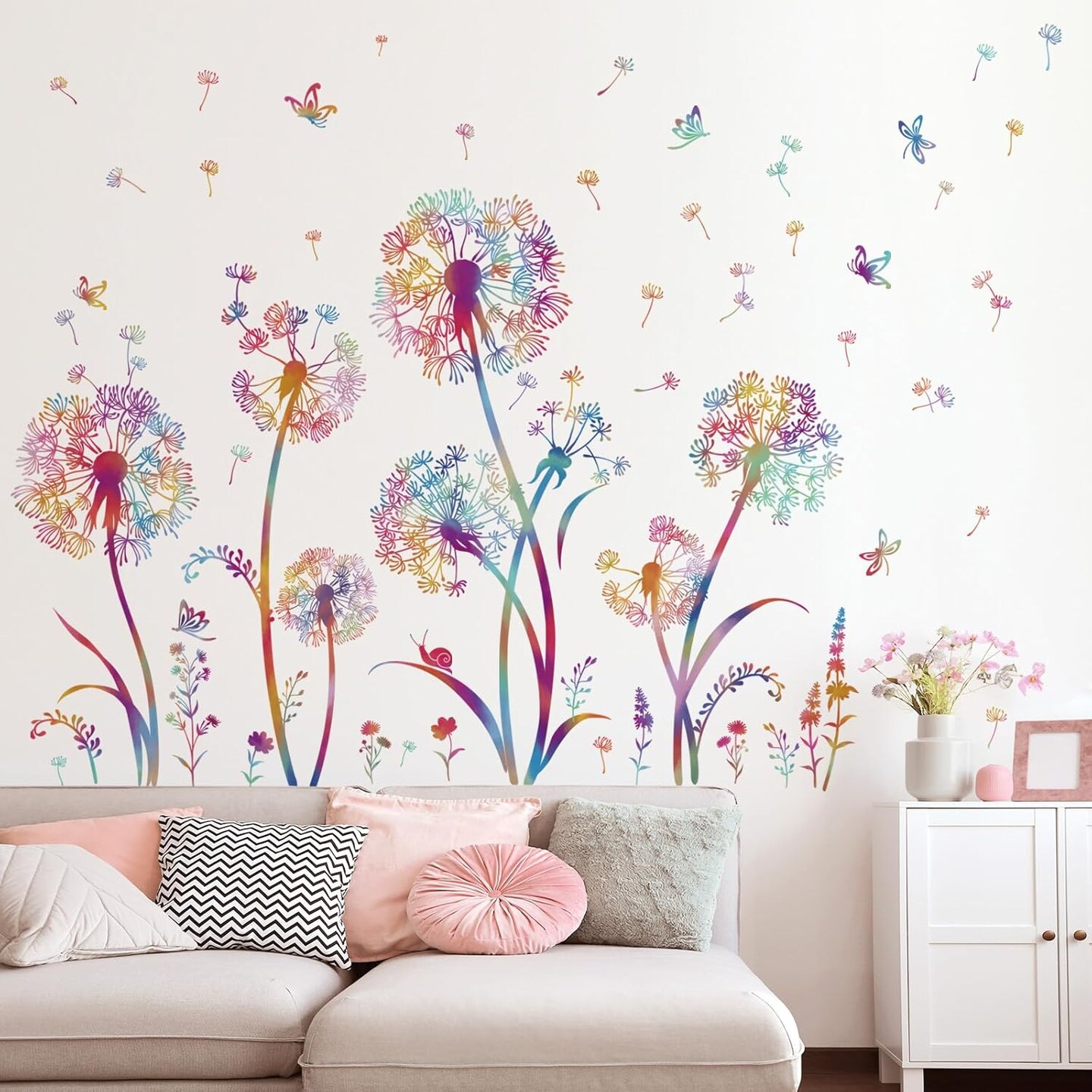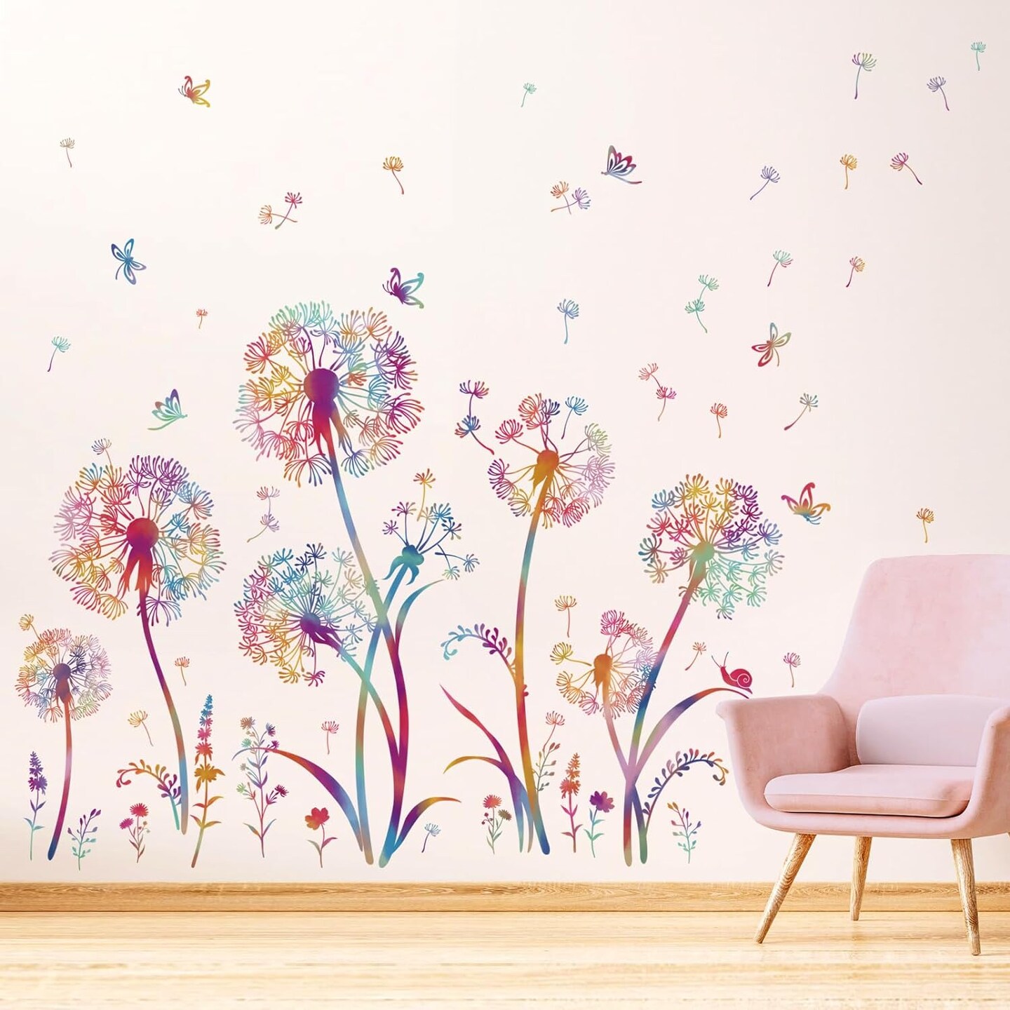 Colorful Blowing Dandelion Wall Decals Flying Flowers Butterflies Floral Peel (Multi)