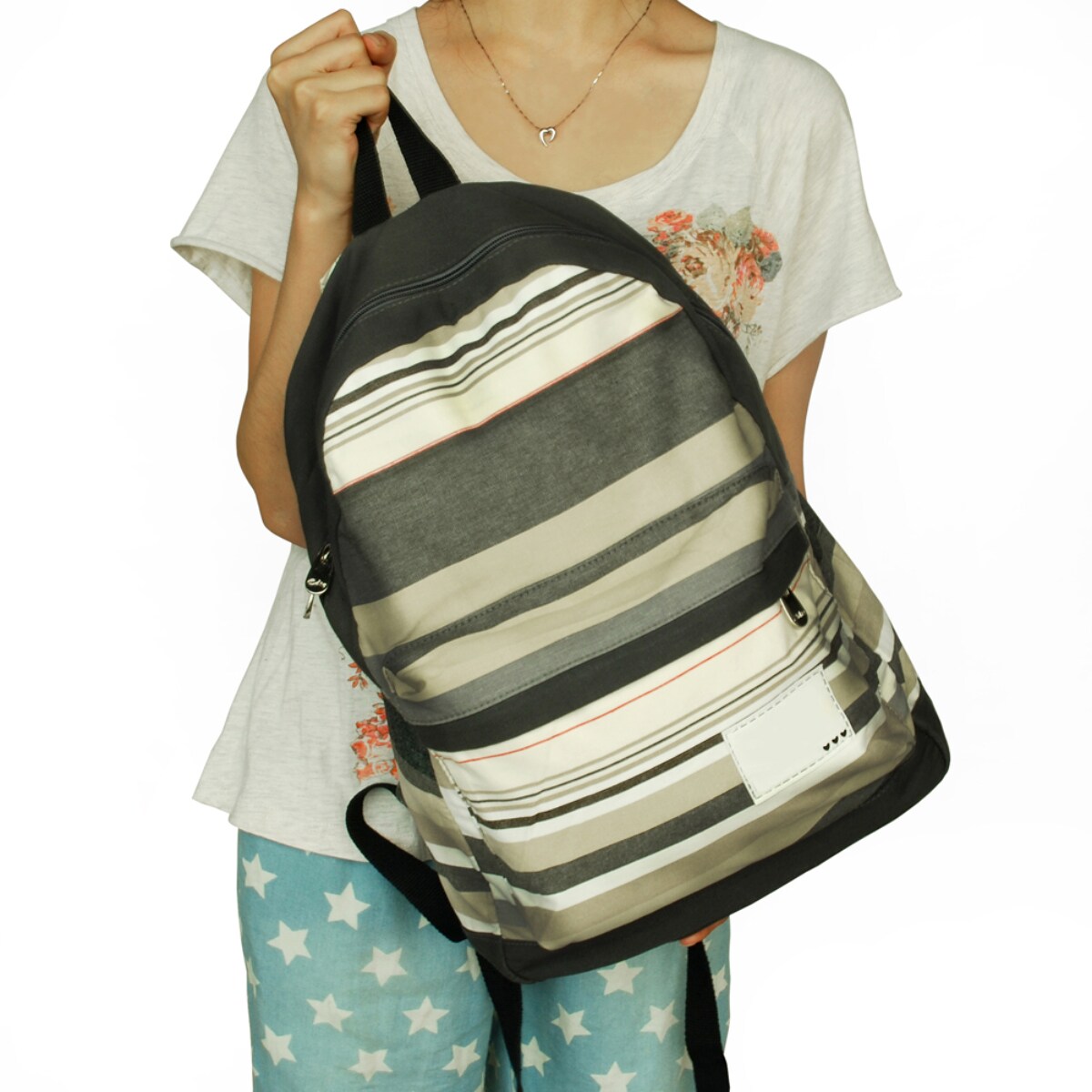 Colorful Fabric Art Backpack, Front Zipper Pocket, Outdoor Daypack, Whimsical, Gray, 16" x 14.5" x 5"