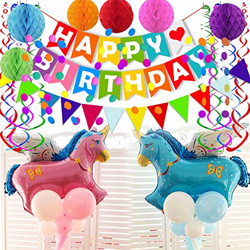 Colorful Happy Birthday Banner with Paper Triangle Flags, Bunting, Circle Confetti Dots, Hanging Garland, Honeycomb Balls, and Swirl Streamers for Birthday and Baby Shower Party Decorations