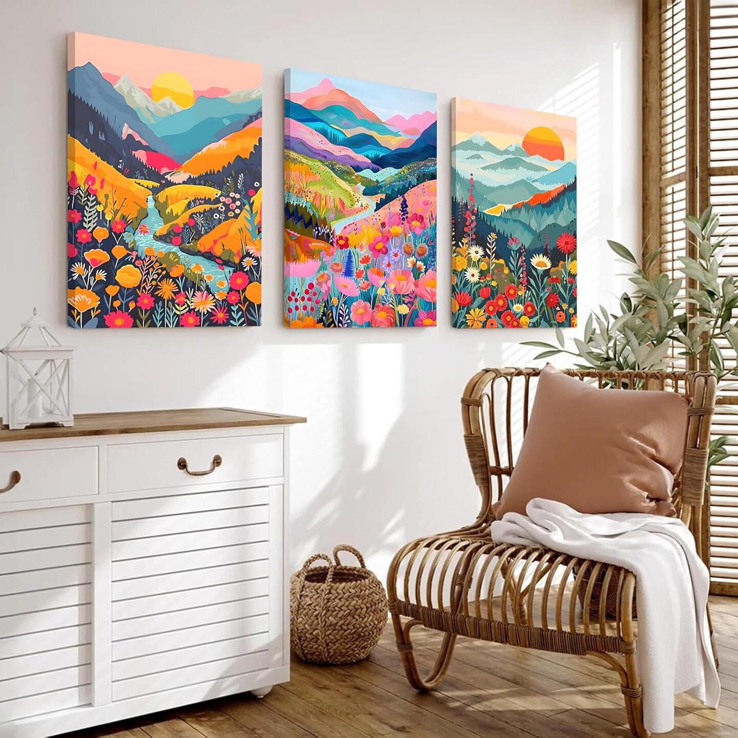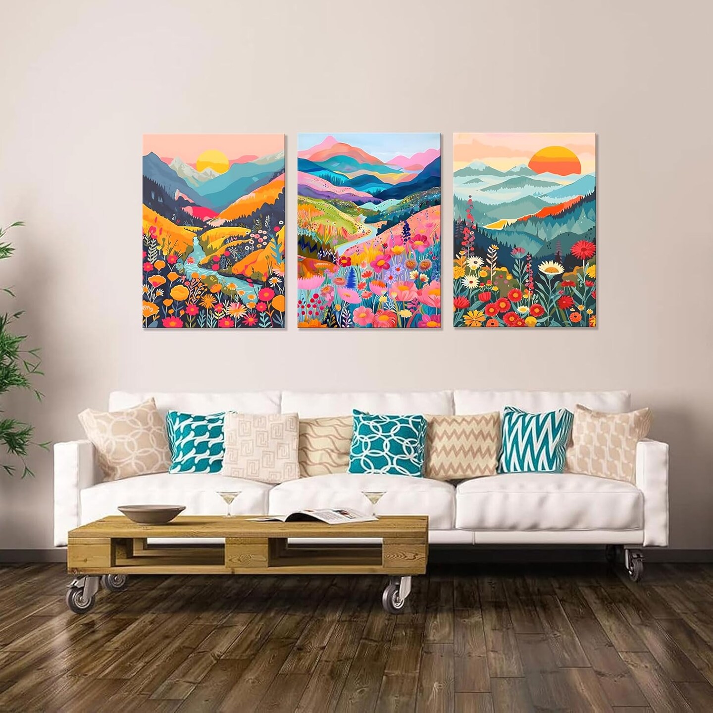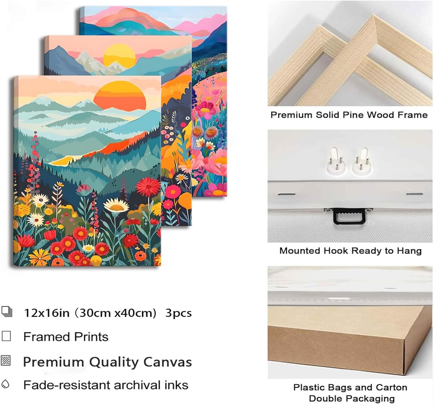 Colorful Watercolor Mountain Canvas Wall Art Set of 3 Boho Flower Picture Wall Decor Abstract Nature Landscape Artwork Paintings Posters Print for Living Room Bedroom Office 16x12In Framed