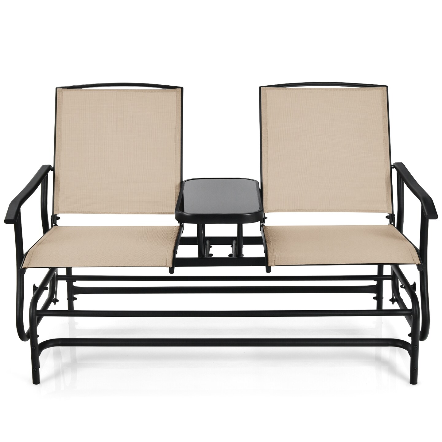 Comfortable 2-Person Double Rocking Loveseat with Glass Table and Armrests