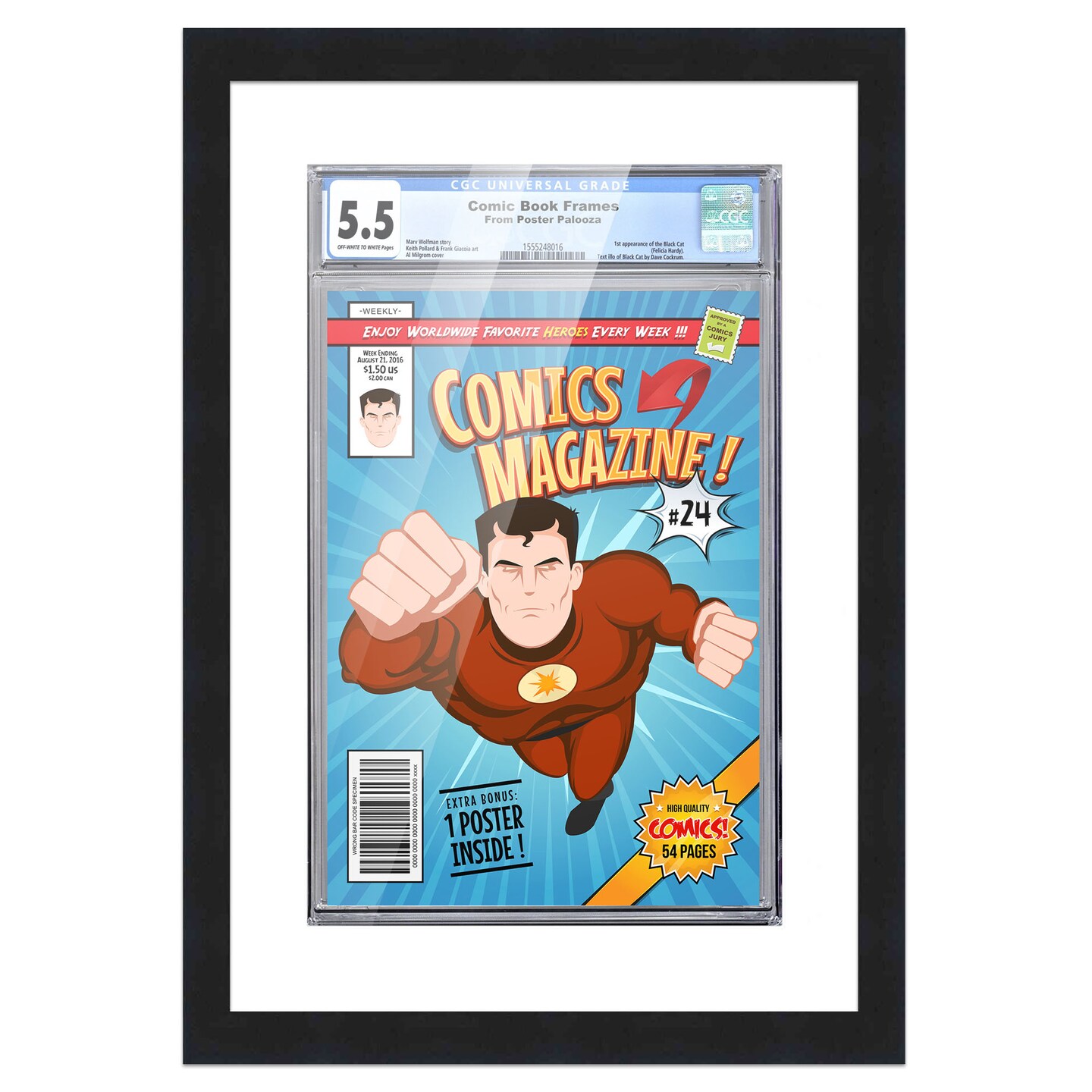 Comic Book Display Frame for CGC, PGX Graded, Slabed Comics - Black Wood Comic Frame With White Mat for 8.125x13 Comics, 18 Frame Sizes