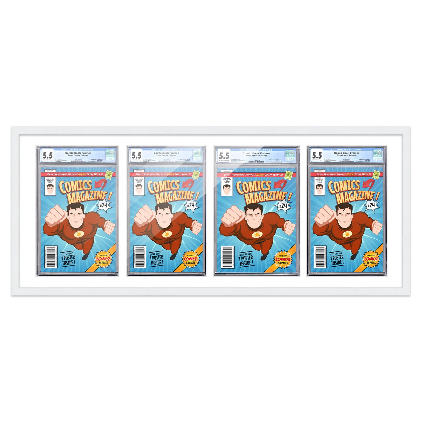 Comic Book Frame with Mat for 4 Graded Comics - White Wood Comic Frame With White Mat for 8.125x13 Comics - 39x16.5 Frame Size