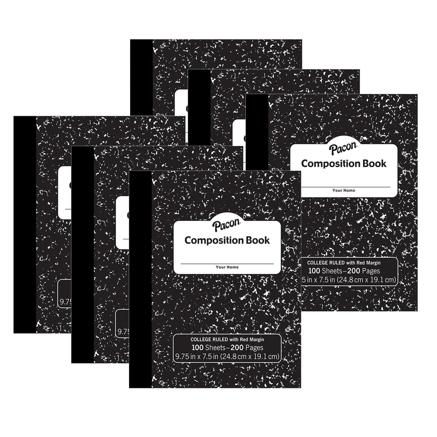 Composition Book, Black Marble, 9/32" Ruled w/ Margin, 9-3/4" x 7-1/2", 100 Sheets, Pack of 6
