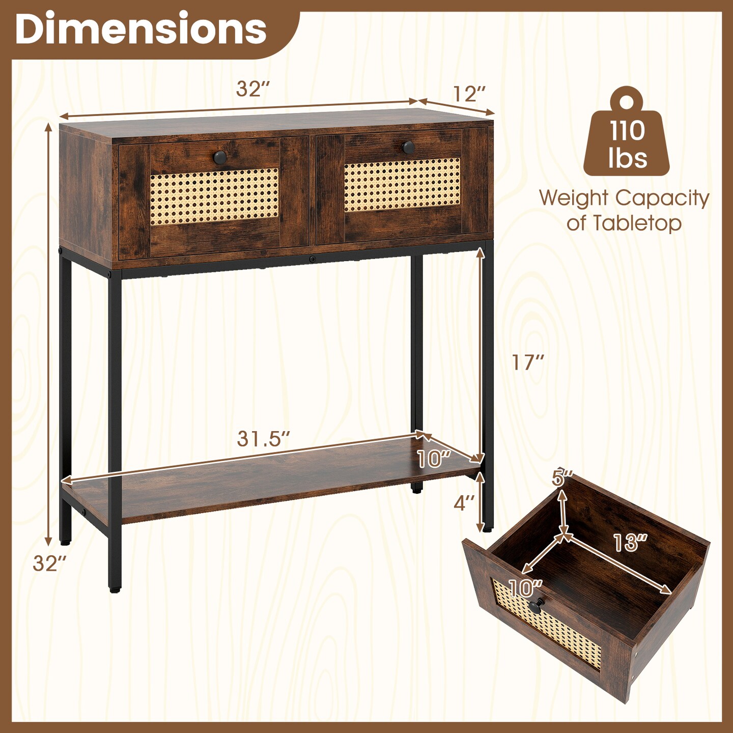 Console Table with 2 Drawers and Storage Shelf, Rattan Front Entryway Table with Metal Legs