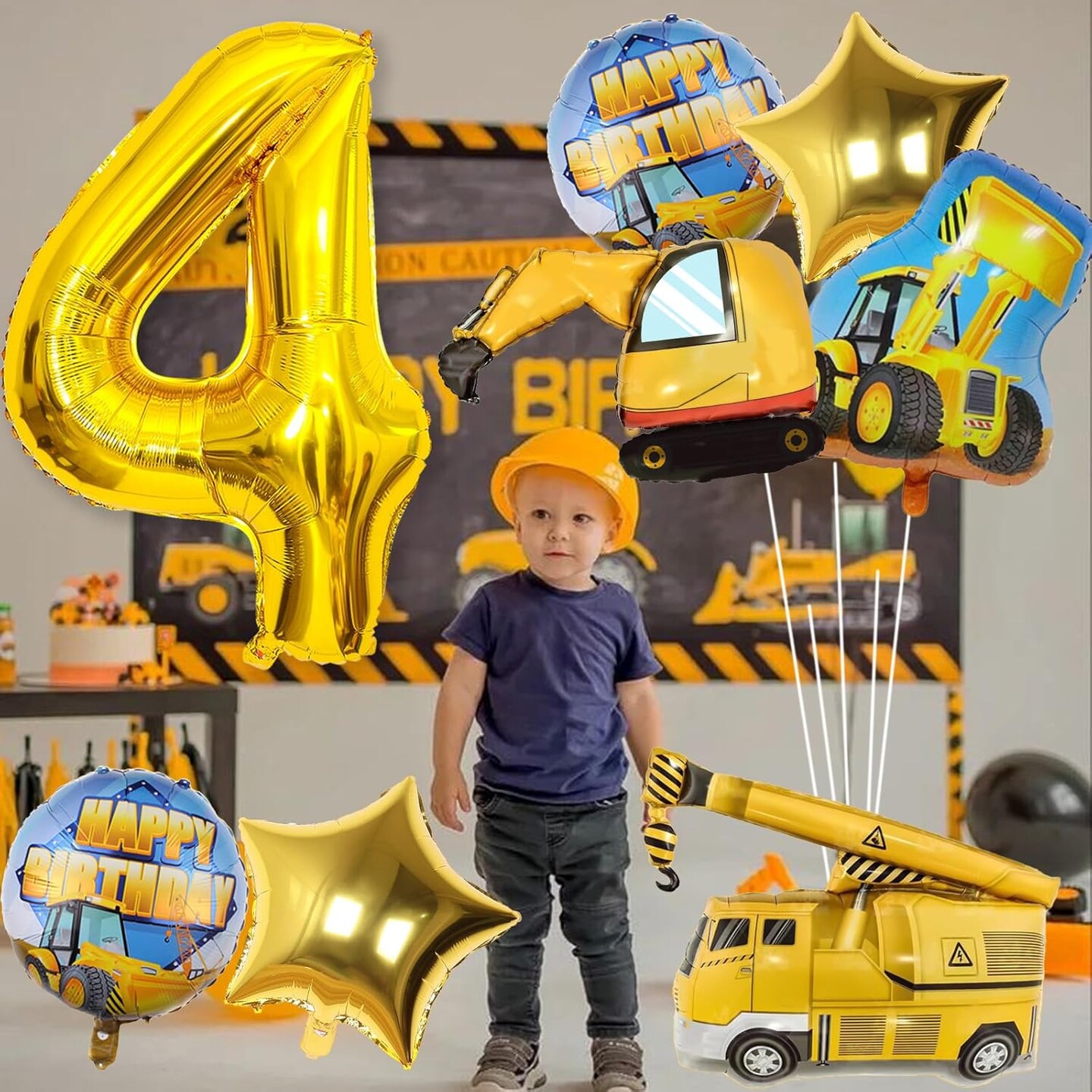 Construction 4th Birthday Balloons – 9-Piece Set with 40-Inch Gold Number 4, Excavator, Dump Truck, Crane, Bulldozer Foil Balloons for Boys’ Construction Party Supplies (Gold)