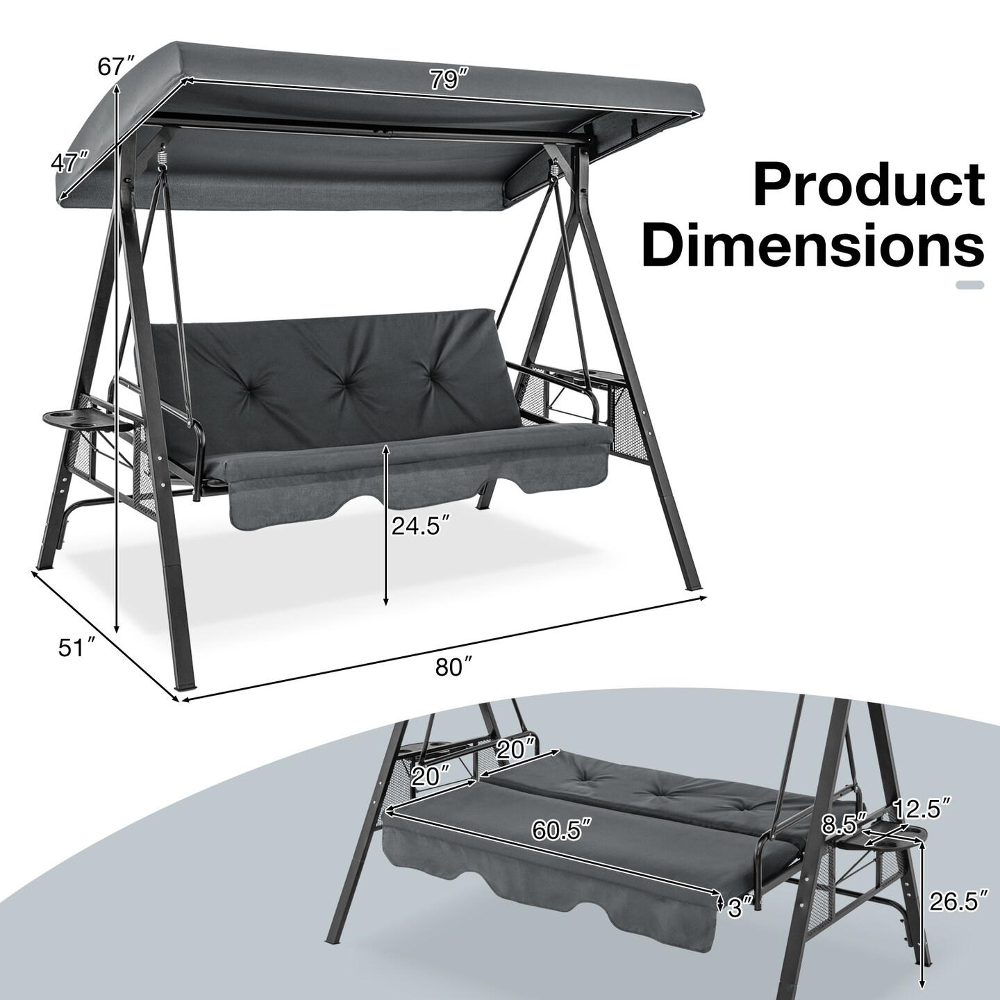 Convertible 3-Seat Patio Porch Swing Chair to Flat Bed with Adjustable Canopy - 80" x 51" x 67" (L x W x H)
